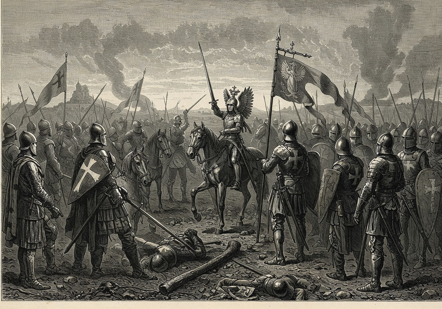 Traditional detailed engraving illustration with modern elements, etched lines, high contrast black and white, meticulous cross-hatching to create depth, printed on aged parchment paper of: Traditional detailed engraving illustration with modern elements, etched lines, high contrast black and white, meticulous cross-hatching to create depth, printed on aged parchment paper of: Medieval battlefield at dawn during the Battle of Grunwald in 1410, Polish and Lithuanian knights in armor gathered before charging, raising swords and shields while singing a hymn, banners with the Virgin Mary fluttering in the wind, smoke rising from the ground, distant enemy Teutonic Knights on horseback approaching, a sense of unity and divine protection in the air. Illustration: copperplate etching texture, ink lines, dramatic shading, artistic style, deep focus, museum quality print with humorous twist. Illustration: copperplate etching texture, ink lines, dramatic shading, artistic style, deep focus, museum quality print with humorous twist.