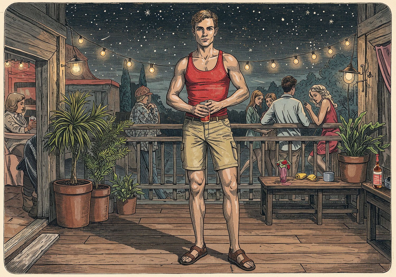 Traditional detailed engraving illustration with modern elements, etched lines, high contrast black and white, meticulous cross-hatching to create depth, printed on aged parchment paper of: Traditional detailed engraving illustration with modern elements, etched lines, high contrast black and white, meticulous cross-hatching to create depth, printed on aged parchment paper of: A fit young man with toned arms and abs wearing a vibrant red tank top, slim khaki shorts reaching mid-thigh, and brown leather sandals, standing confidently on a wooden terrace during a summer evening party, holding a cool drink, surrounded by string lights, potted plants, friends laughing in the background, and a starry sky overhead. Illustration: copperplate etching texture, ink lines, dramatic shading, artistic style, deep focus, museum quality print with humorous twist. Illustration: copperplate etching texture, ink lines, dramatic shading, artistic style, deep focus, museum quality print with humorous twist.
