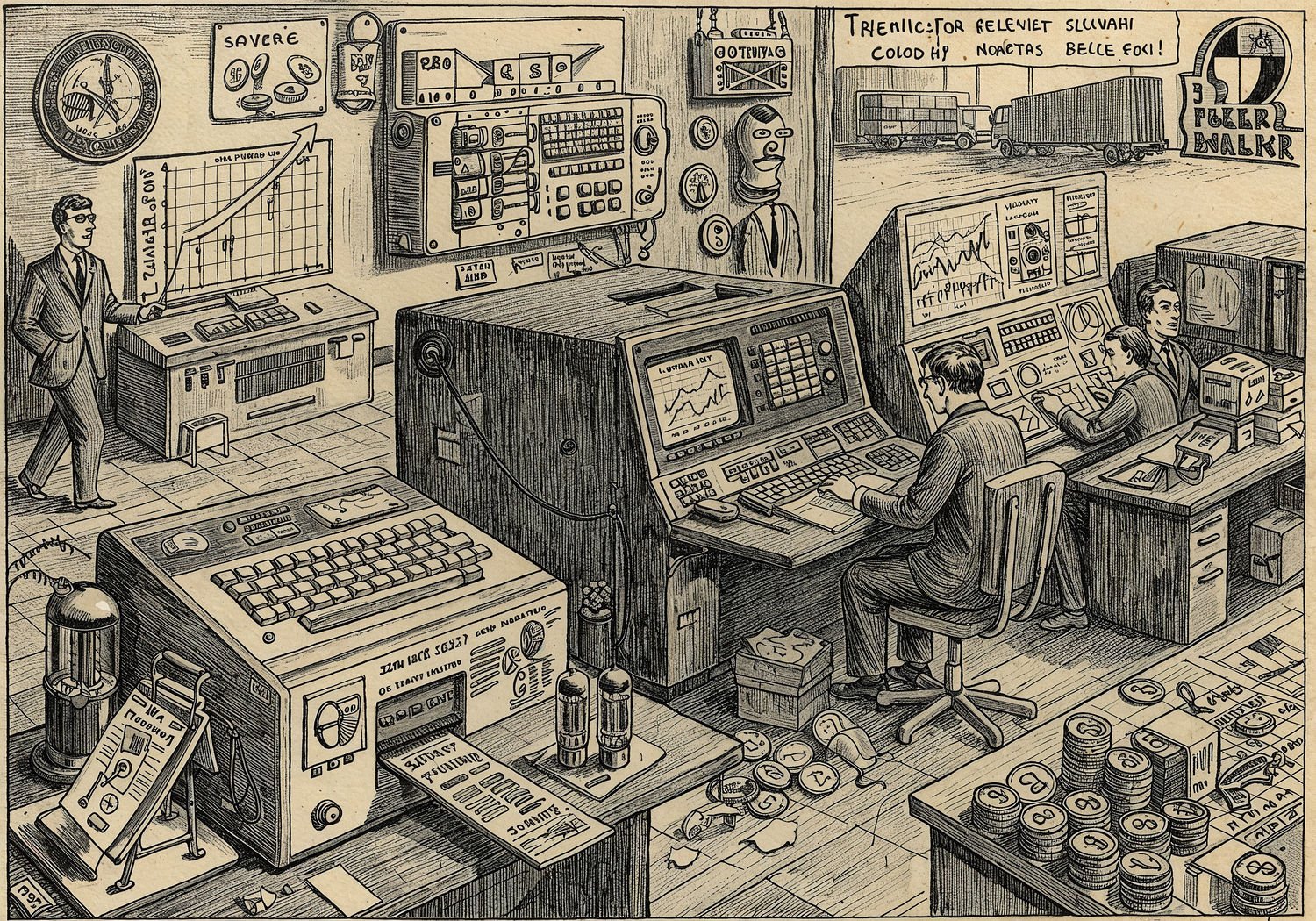 Traditional detailed engraving illustration with modern elements, etched lines, high contrast black and white, meticulous cross-hatching to create depth, printed on aged parchment paper of: Traditional detailed engraving illustration with modern elements, etched lines, high contrast black and white, meticulous cross-hatching to create depth, printed on aged parchment paper of: A dynamic scene from the 1960s showing a bustling office where a compact transistor-based computer like the IBM 1401 processes payroll data on punch cards, with business professionals in suits analyzing rising stock market graphs and inventory charts on nearby desks, symbolizing economic growth; in the background, a large vacuum tube computer from the 1940s fades into obsolescence, contrasted by stacks of saved money and efficient supply chain icons like trucks and warehouses, evoking the transistor revolution’s impact on automation and scalability. Illustration: copperplate etching texture, ink lines, dramatic shading, artistic style, deep focus, museum quality print with humorous twist. Illustration: copperplate etching texture, ink lines, dramatic shading, artistic style, deep focus, museum quality print with humorous twist.