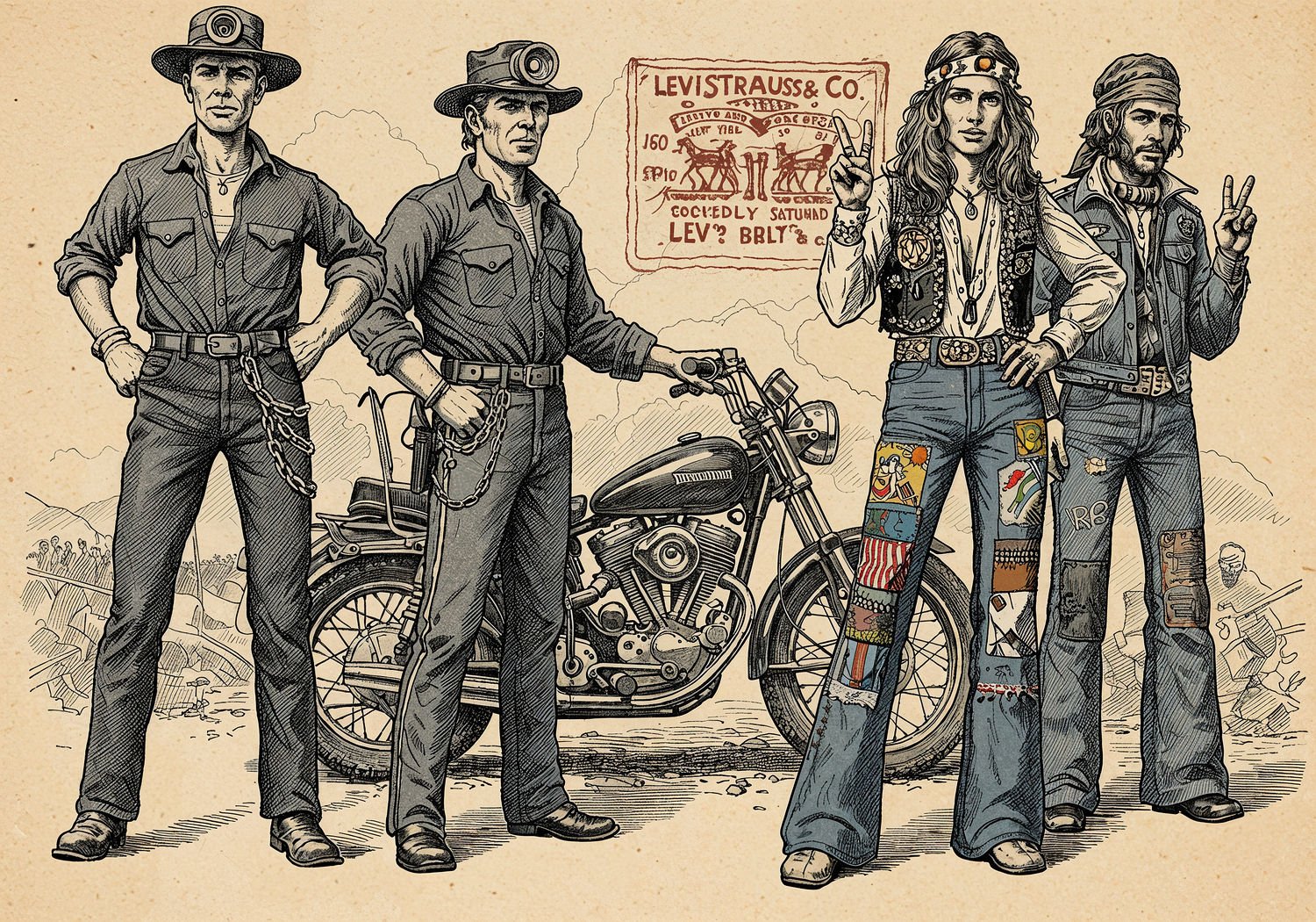 Traditional detailed engraving illustration with modern elements, etched lines, high contrast black and white, meticulous cross-hatching to create depth, printed on aged parchment paper of: Traditional detailed engraving illustration with modern elements, etched lines, high contrast black and white, meticulous cross-hatching to create depth, printed on aged parchment paper of: A historical montage illustrating the evolution of Levi’s jeans: in the foreground, a 1980s fashion model strutting on a runway in slim-fit designer jeans with embroidered pockets; to the right, a 1960s hippie at Woodstock festival wearing colorful patched bell-bottom jeans, holding a peace sign; in the background left, a 1950s biker on a motorcycle in rugged 501 jeans with leather jacket and chains; furthest back, a 19th-century gold miner in original riveted denim pants working in a California mine, with a Levi Strauss & Co. label visible on all figures. Illustration: copperplate etching texture, ink lines, dramatic shading, artistic style, deep focus, museum quality print with humorous twist. Illustration: copperplate etching texture, ink lines, dramatic shading, artistic style, deep focus, museum quality print with humorous twist.
