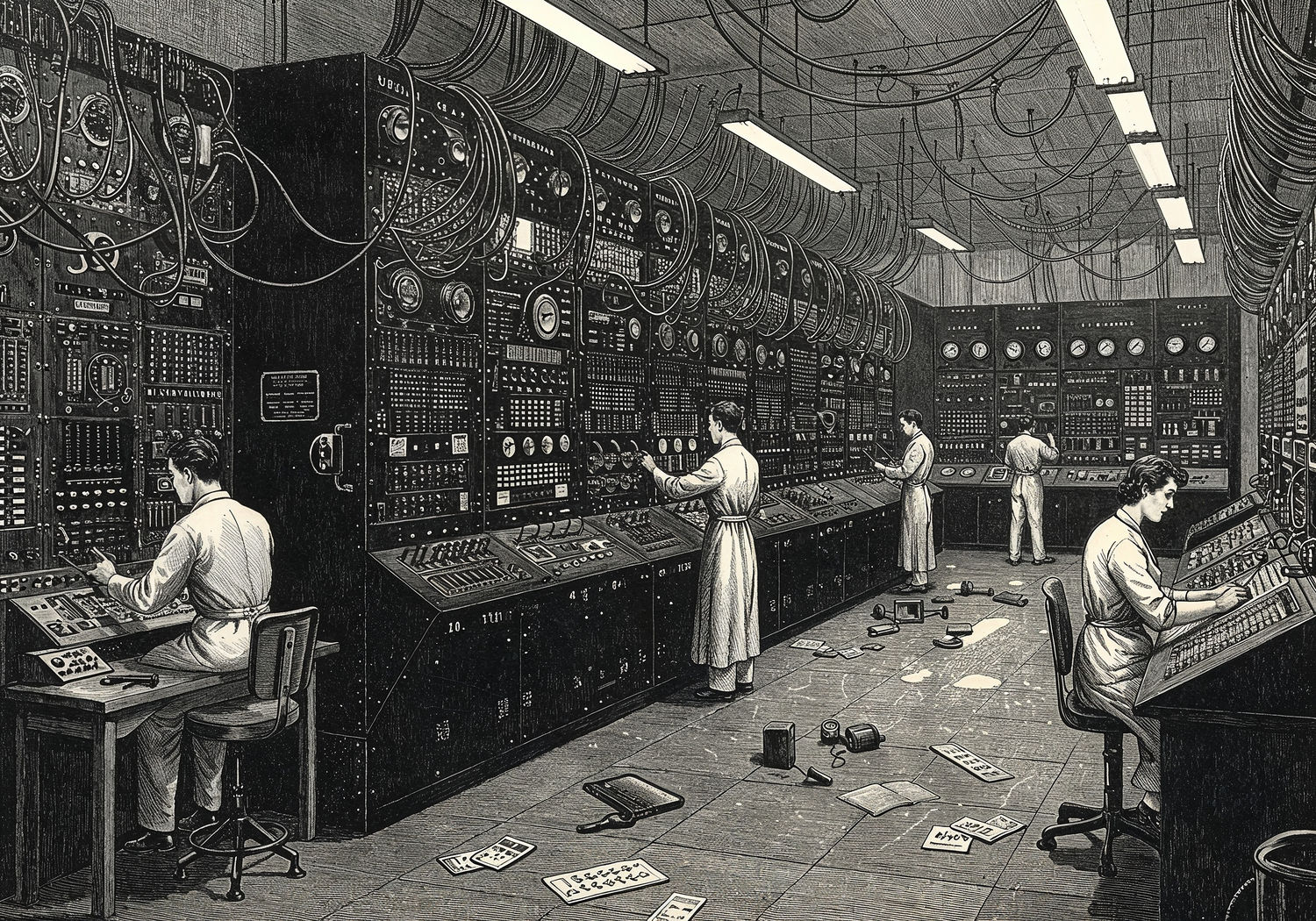 Traditional detailed engraving illustration with modern elements, etched lines, high contrast black and white, meticulous cross-hatching to create depth, printed on aged parchment paper of: Traditional detailed engraving illustration with modern elements, etched lines, high contrast black and white, meticulous cross-hatching to create depth, printed on aged parchment paper of: A vast indoor room occupied by the enormous ENIAC computer, featuring dozens of tall black panels densely packed with glowing vacuum tubes, rotary switches, and thick bundles of cables connecting them like a web, engineers in 1940s attire adjusting wires and dials, female programmers entering data via plugboards, blinking lights across the panels, scattered punch cards and tools on the floor, highlighting the machine’s immense scale and complexity during World War II. Illustration: copperplate etching texture, ink lines, dramatic shading, artistic style, deep focus, museum quality print with humorous twist. Illustration: copperplate etching texture, ink lines, dramatic shading, artistic style, deep focus, museum quality print with humorous twist.