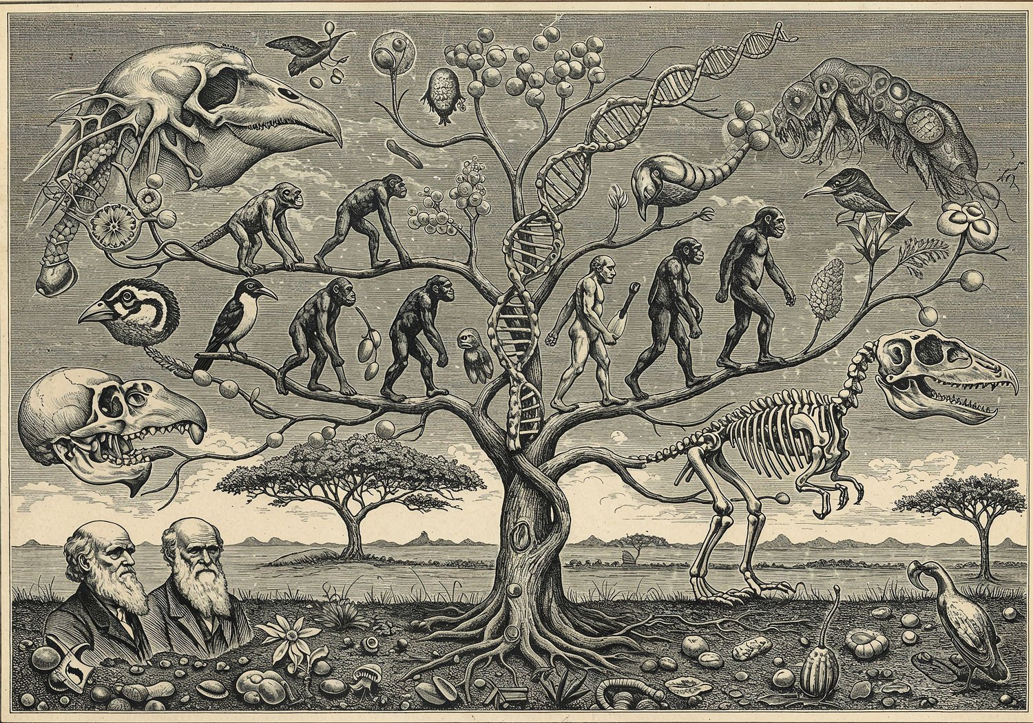 Traditional detailed engraving illustration with modern elements, etched lines, high contrast black and white, meticulous cross-hatching to create depth, printed on aged parchment paper of: Traditional detailed engraving illustration with modern elements, etched lines, high contrast black and white, meticulous cross-hatching to create depth, printed on aged parchment paper of: A central tree of life branching from a common ancient ancestor at the base, with roots in African savanna soil symbolizing human origins; on one branch, Charles Darwin observing Galapagos finches with varied beak shapes adapting to different foods; nearby, a fossil skeleton of Archaeopteryx transitioning from dinosaur to bird; further up, a sequence of human evolution figures from Australopithecus afarensis like Lucy walking upright, to Homo erectus using tools and fire, culminating in modern Homo sapiens; intertwined with the branches, glowing DNA double helices showing genetic similarities between humans and chimpanzees, with molecular clock ticks marking time; in the background, subtle elements of modern evolution like bacteria resisting antibiotics and Neanderthal skulls hybridizing with human figures; overall, dynamic flow from past to present emphasizing ongoing natural selection and adaptation. Illustration: copperplate etching texture, ink lines, dramatic shading, artistic style, deep focus, museum quality print with humorous twist. Illustration: copperplate etching texture, ink lines, dramatic shading, artistic style, deep focus, museum quality print with humorous twist.