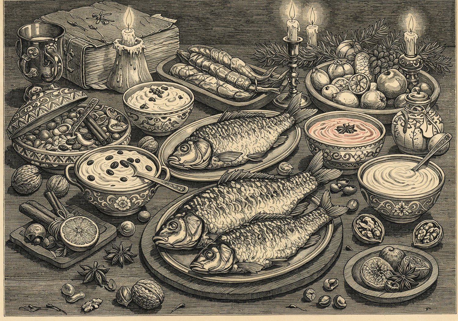 Traditional detailed engraving illustration, etched lines, high contrast black and white, meticulous cross-hatching to create depth, printed on aged parchment paper of: Traditional detailed engraving illustration, etched lines, high contrast black and white, meticulous cross-hatching to create depth, printed on aged parchment paper of: A festive Polish Christmas Eve table laden with golden-fried carp and salted herring fillets as the centerpiece, surrounded by an array of colorful sauces in ornate bowls: a thick gingerbread sauce with cinnamon sticks and raisins, a creamy horseradish sauce mixed with grated beets and apples for a pink hue, a nutty almond sauce with ground walnuts and dried figs, and a fruit-based sauce with apricots and honey; scattered historical elements like medieval spice pouches, old recipe books, and symbolic nuts and dried fruits on wooden platters, evoking centuries of culinary evolution under soft candlelight. Illustration: copperplate etching texture, ink lines, dramatic shading, art style inspired by Gustave Doré and Albrecht Dürer, deep focus, museum quality print. Illustration: copperplate etching texture, ink lines, dramatic shading, art style inspired by Gustave Doré and Albrecht Dürer, deep focus, museum quality print.