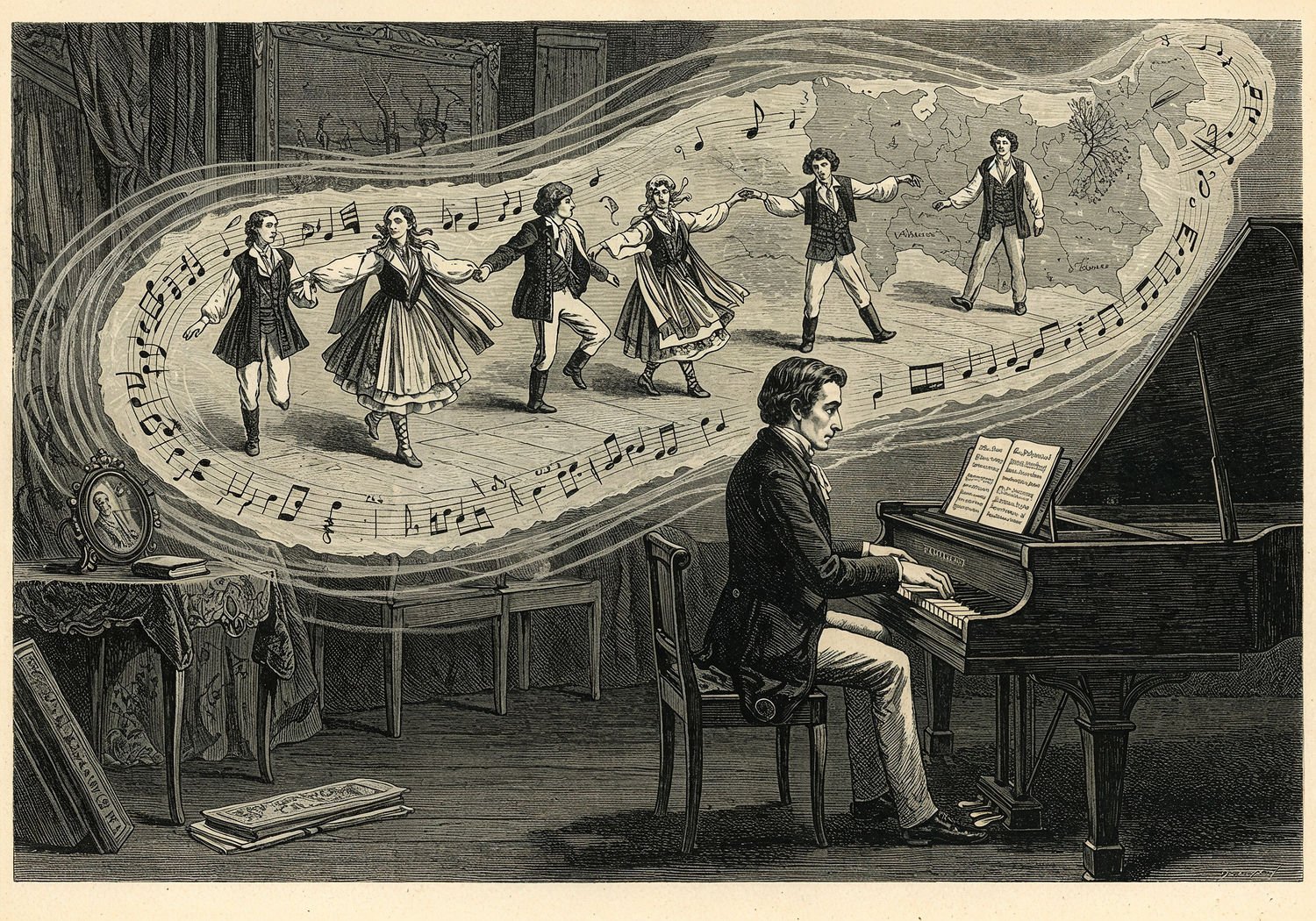 Traditional detailed engraving illustration with modern elements, etched lines, high contrast black and white, meticulous cross-hatching to create depth, printed on aged parchment paper of: Traditional detailed engraving illustration with modern elements, etched lines, high contrast black and white, meticulous cross-hatching to create depth, printed on aged parchment paper of: Fryderyk Chopin seated at a grand piano in a dimly lit Parisian salon, his hands poised over the keys as he composes, with ethereal visions of Polish peasants dancing a lively mazurka in traditional attire emerging from swirling musical notes, a faint outline of partitioned Poland’s map in the background symbolizing lost homeland and national soul. Illustration: copperplate etching texture, ink lines, dramatic shading, artistic style, deep focus, museum quality print with humorous twist. Illustration: copperplate etching texture, ink lines, dramatic shading, artistic style, deep focus, museum quality print with humorous twist.