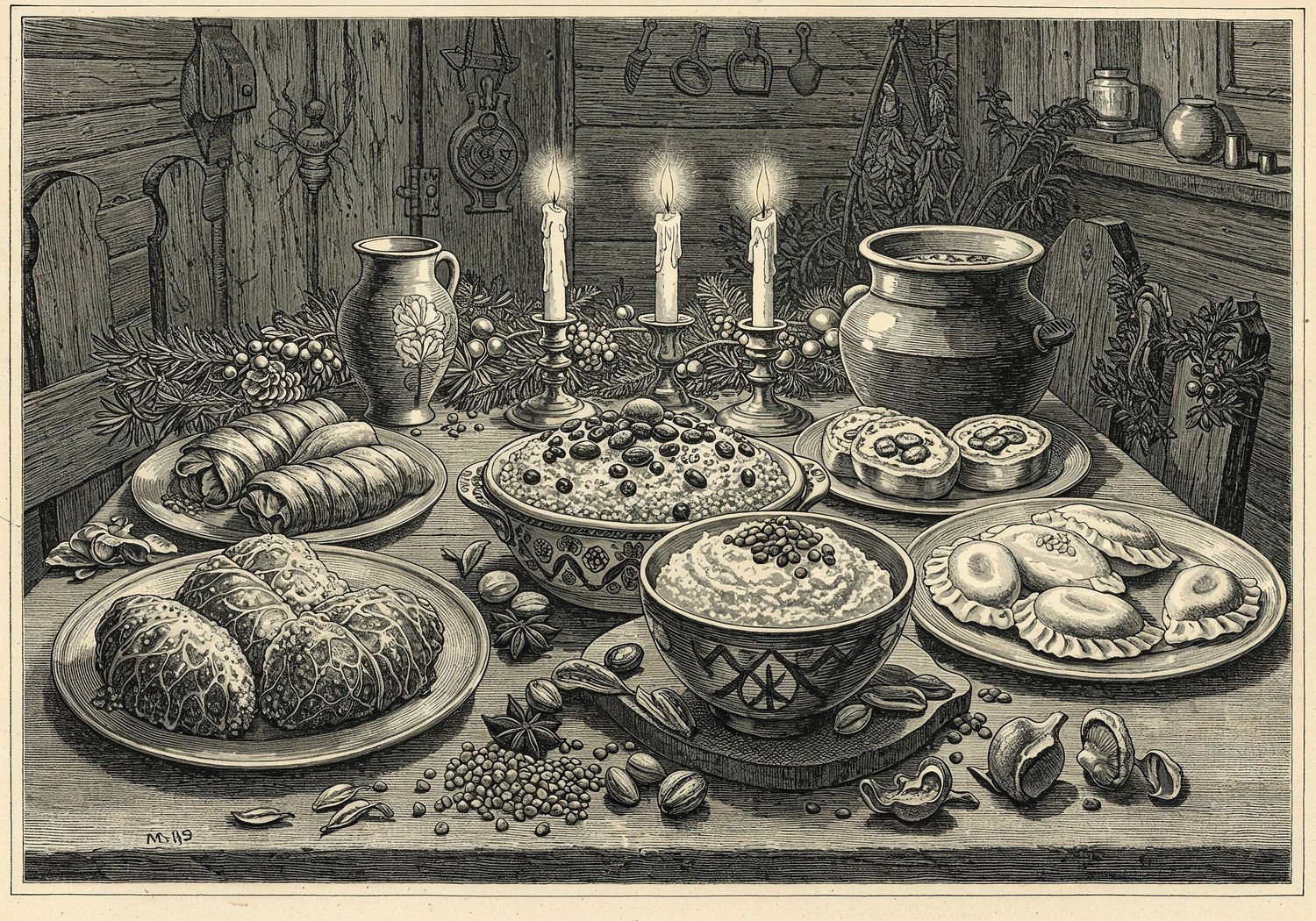 Traditional detailed engraving illustration, etched lines, high contrast black and white, meticulous cross-hatching to create depth, printed on aged parchment paper of: Traditional detailed engraving illustration, etched lines, high contrast black and white, meticulous cross-hatching to create depth, printed on aged parchment paper of: A traditional Polish Christmas Eve table set for Wigilia, featuring a central bowl of kutia made with barley kasha, honey, poppy seeds, raisins, and nuts; surrounded by plates of gołąbki stuffed with buckwheat kasha and mushrooms wrapped in cabbage leaves; pierogi filled with millet kasha and cheese; a pot of barley kasha soup with vegetables and dried mushrooms; scattered grains of buckwheat, barley, and millet on the tablecloth; lit advent candles and evergreen branches as decorations; in the background, a rustic wooden interior with a family gathered around, evoking warmth and forgotten heritage. Illustration: copperplate etching texture, ink lines, dramatic shading, art style inspired by Gustave Doré and Albrecht Dürer, deep focus, museum quality print. Illustration: copperplate etching texture, ink lines, dramatic shading, art style inspired by Gustave Doré and Albrecht Dürer, deep focus, museum quality print.