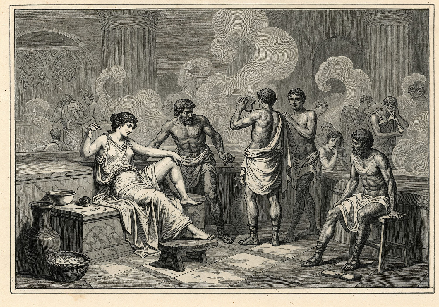 Traditional detailed engraving illustration with modern elements, etched lines, high contrast black and white, meticulous cross-hatching to create depth, printed on aged parchment paper of: Traditional detailed engraving illustration with modern elements, etched lines, high contrast black and white, meticulous cross-hatching to create depth, printed on aged parchment paper of: Ancient Roman scene in a bustling thermae bathhouse where a noblewoman reclines on a marble bench as a servant applies a lime-based depilatory paste to her arm and leg, while nearby a gladiator rubs a pumice stone on his chest, steam rising from hot pools, diverse Romans including men and women engaged in grooming rituals, emphasizing smooth skin and hygiene in a hot Mediterranean climate. Illustration: copperplate etching texture, ink lines, dramatic shading, artistic style, deep focus, museum quality print with humorous twist. Illustration: copperplate etching texture, ink lines, dramatic shading, artistic style, deep focus, museum quality print with humorous twist.