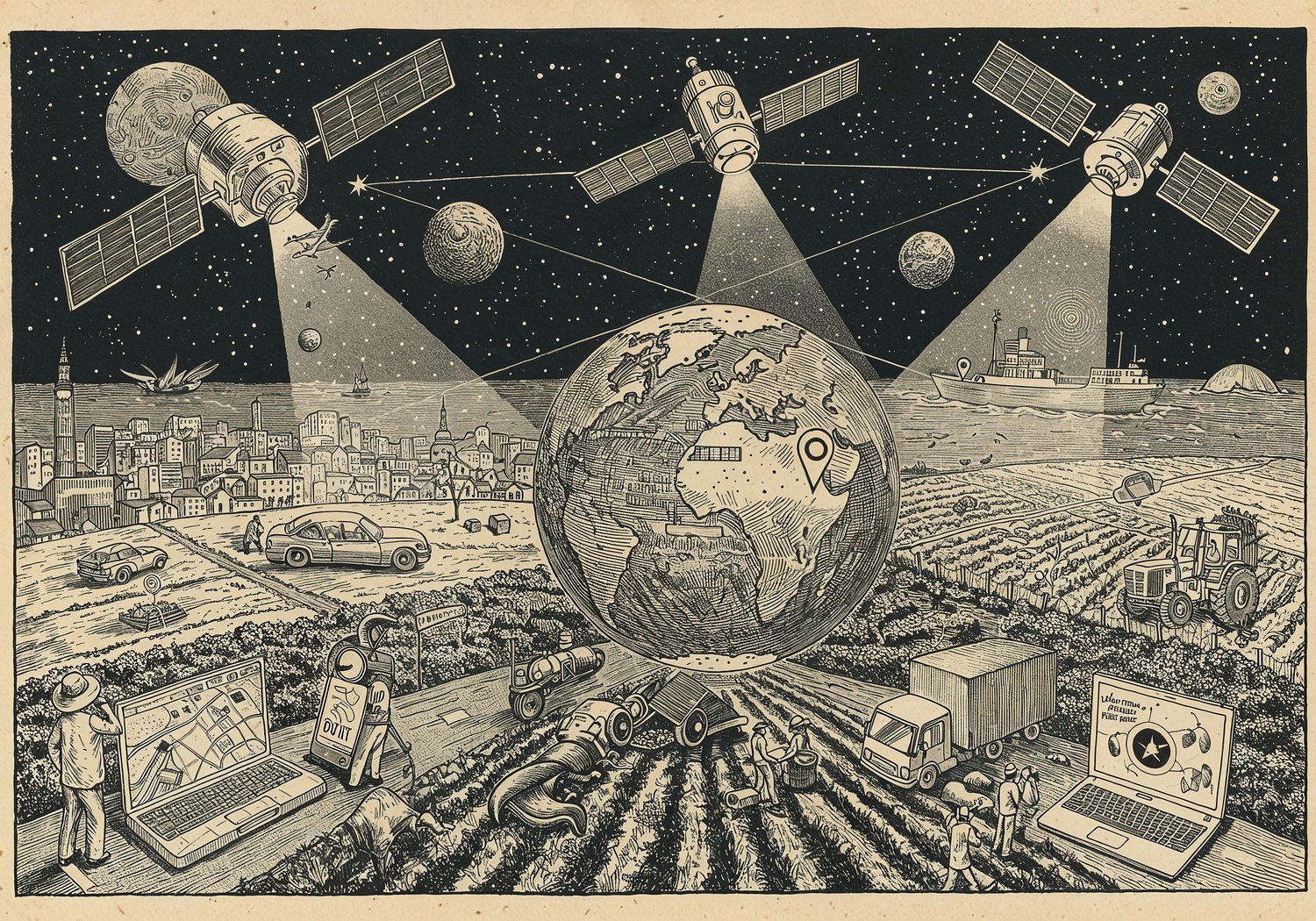 Traditional detailed engraving illustration with modern elements, etched lines, high contrast black and white, meticulous cross-hatching to create depth, printed on aged parchment paper of: Traditional detailed engraving illustration with modern elements, etched lines, high contrast black and white, meticulous cross-hatching to create depth, printed on aged parchment paper of: A constellation of satellites orbiting Earth in space, beaming invisible radio signals downward to various scenes on the planet’s surface: a driver in a car using a GPS app on a smartphone to navigate a city road, a cargo ship at sea with a satellite phone in use by the captain, a farmer in a field operating a tractor with precision GPS guidance, a delivery truck tracking packages in real-time, and people in remote areas connecting via satellite internet on laptops during a video call, all connected by glowing signal lines from space to Earth, symbolizing global communication and navigation. Illustration: copperplate etching texture, ink lines, dramatic shading, artistic style, deep focus, museum quality print with humorous twist. Illustration: copperplate etching texture, ink lines, dramatic shading, artistic style, deep focus, museum quality print with humorous twist.