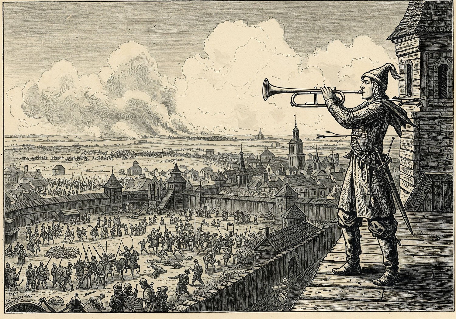 Traditional detailed engraving illustration with modern elements, etched lines, high contrast black and white, meticulous cross-hatching to create depth, printed on aged parchment paper of: Traditional detailed engraving illustration with modern elements, etched lines, high contrast black and white, meticulous cross-hatching to create depth, printed on aged parchment paper of: A young medieval trumpeter standing on the high tower of St. Mary’s Basilica in Kraków, blowing his long brass trumpet urgently towards the north to sound the alarm, with a Tatar arrow piercing his throat mid-note, blood trickling down; in the background, a massive dust cloud rises from the horizon as a horde of Mongol warriors on horseback charges towards the city, their bows drawn; below, the medieval Kraków skyline with wooden walls, defenders rushing to prepare, and panicked citizens fleeing into the streets; the scene set at dawn with dramatic tension. Illustration: copperplate etching texture, ink lines, dramatic shading, artistic style, deep focus, museum quality print with humorous twist. Illustration: copperplate etching texture, ink lines, dramatic shading, artistic style, deep focus, museum quality print with humorous twist.
