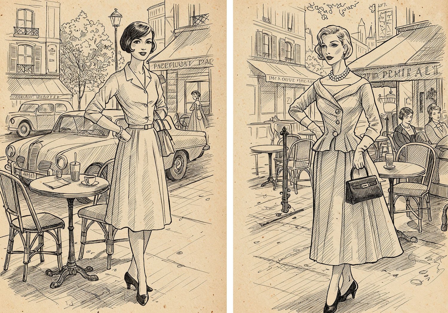 Traditional detailed engraving illustration with modern elements, etched lines, high contrast black and white, meticulous cross-hatching to create depth, printed on aged parchment paper of: Traditional detailed engraving illustration with modern elements, etched lines, high contrast black and white, meticulous cross-hatching to create depth, printed on aged parchment paper of: Two elegant women from the 1950s standing side by side in a post-war Parisian street scene, representing contrasting styles of femininity; on the left, a slender woman with short bob hair, natural makeup, wearing a simple knee-length A-line dress, white blouse, black balerina flats, and a subtle smile, evoking freedom and minimalism; on the right, a poised woman with blonde updo, red lips, porcelain skin, in a fitted klepsydra silhouette gown with full skirt, pearl necklace, silk scarf, and Hermès handbag, exuding aristocratic luxury and control; background includes vintage cars, cafe tables, and soft sunlight symbolizing hope and renewal. Illustration: copperplate etching texture, ink lines, dramatic shading, artistic style, deep focus, museum quality print with humorous twist. Illustration: copperplate etching texture, ink lines, dramatic shading, artistic style, deep focus, museum quality print with humorous twist.