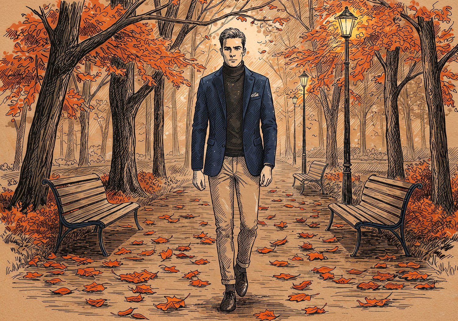 Traditional detailed engraving illustration with modern elements, etched lines, high contrast black and white, meticulous cross-hatching to create depth, printed on aged parchment paper of: Traditional detailed engraving illustration with modern elements, etched lines, high contrast black and white, meticulous cross-hatching to create depth, printed on aged parchment paper of: A stylish man walking leisurely through an autumn park path lined with colorful falling leaves in shades of orange and red, wearing a navy blue single-breasted blazer with narrow notch lapels unbuttoned over a black turtleneck, paired with slim-fit beige chinos ending above the ankles, simple leather shoes, and a subtle earth-toned scarf, with soft sunlight filtering through the trees and a gentle breeze implied by scattered leaves. Illustration: copperplate etching texture, ink lines, dramatic shading, artistic style, deep focus, museum quality print with humorous twist. Illustration: copperplate etching texture, ink lines, dramatic shading, artistic style, deep focus, museum quality print with humorous twist.