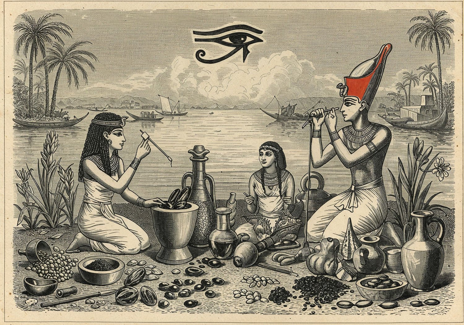 Traditional detailed engraving illustration with modern elements, etched lines, high contrast black and white, meticulous cross-hatching to create depth, printed on aged parchment paper of: Traditional detailed engraving illustration with modern elements, etched lines, high contrast black and white, meticulous cross-hatching to create depth, printed on aged parchment paper of: Ancient Egyptian scene along the Nile River, showing a diverse group of people including a woman, a worker, and a pharaoh applying black kohl paste around their eyes with thin applicators, surrounded by alabaster mortars containing ground galena and malachit minerals, castor seeds, and oil jars; in the background, dusty winds blow over reed boats and palm trees, with the symbolic Eye of Horus floating above as a protective talisman, evoking beauty, medicine, and cultural ritual. Illustration: copperplate etching texture, ink lines, dramatic shading, artistic style, deep focus, museum quality print with humorous twist. Illustration: copperplate etching texture, ink lines, dramatic shading, artistic style, deep focus, museum quality print with humorous twist.