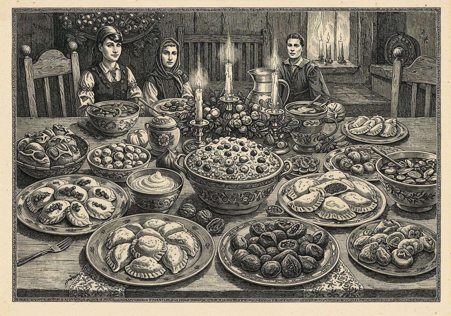 Traditional detailed engraving illustration, etched lines, high contrast black and white, meticulous cross-hatching to create depth, printed on aged parchment paper of: Traditional detailed engraving illustration, etched lines, high contrast black and white, meticulous cross-hatching to create depth, printed on aged parchment paper of: A warmly lit Polish Christmas Eve dinner table set for Wigilia, featuring a central bowl of kutia made from wheat grains mixed with honey, ground poppy seeds, raisins, dried apricots, figs, and walnuts, surrounded by platters of steamed pierogi dumplings with fillings visible like mushrooms with onions, cabbage and dried plums, poppy seed with honey and raisins, and potato with caramelized onions, accompanied by bowls of borscht, dried fruit compote, and Christmas opłatek wafers, with subtle Eastern decorative motifs like embroidered tablecloth patterns inspired by Ukrainian and Lithuanian folk designs, candles flickering, and a family gathering in the background sharing the meal. Illustration: copperplate etching texture, ink lines, dramatic shading, art style inspired by Gustave Doré and Albrecht Dürer, deep focus, museum quality print. Illustration: copperplate etching texture, ink lines, dramatic shading, art style inspired by Gustave Doré and Albrecht Dürer, deep focus, museum quality print.