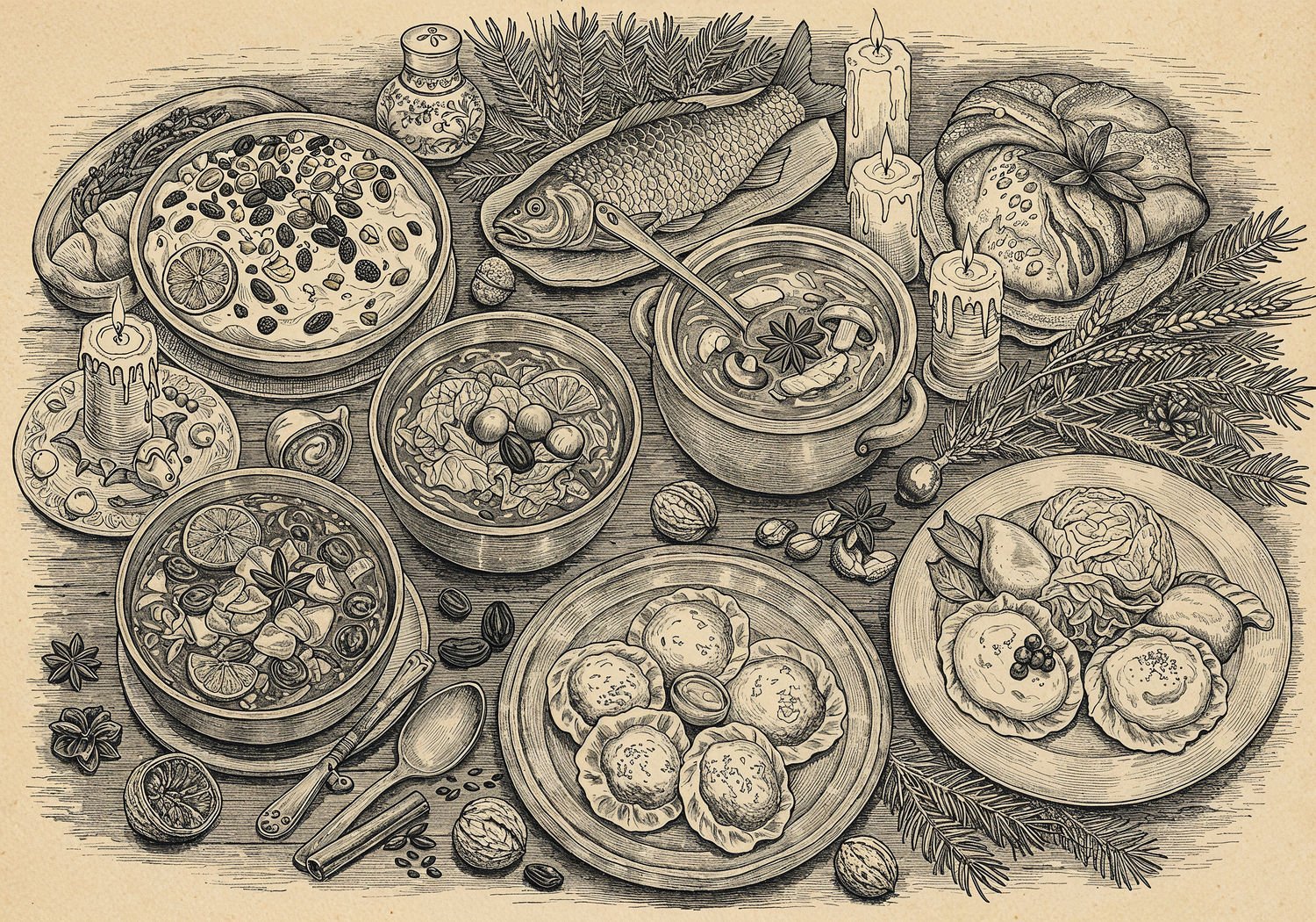 Traditional detailed engraving illustration, etched lines, high contrast black and white, meticulous cross-hatching to create depth, printed on aged parchment paper of: Traditional detailed engraving illustration, etched lines, high contrast black and white, meticulous cross-hatching to create depth, printed on aged parchment paper of: A festive Polish Christmas Eve table viewed from above, featuring a variety of regional dishes: a bowl of moczka dessert with soaked fruits, almonds, raisins, and crumbled gingerbread from Wielkopolska; a steaming pot of siemieniotka flaxseed soup with garlic and dried plums from Śląsk; a rustic bowl of mushroom borscht and pierogi filled with cabbage and wild mushrooms from Podhale; a dish of kutia made with wheat, poppy seeds, honey, and nuts from Kresy; alongside common elements like carp, uszka dumplings, makowiec, and opłatek wafers; subtle regional symbols including wheat fields for Wielkopolska, coal mines for Śląsk, Tatra mountains for Podhale, and eastern steppes for Kresy; Christmas candles, evergreen branches, and a faint outline of Poland’s map connecting the regions. Illustration: copperplate etching texture, ink lines, dramatic shading, art style inspired by Gustave Doré and Albrecht Dürer, deep focus, museum quality print. Illustration: copperplate etching texture, ink lines, dramatic shading, art style inspired by Gustave Doré and Albrecht Dürer, deep focus, museum quality print.