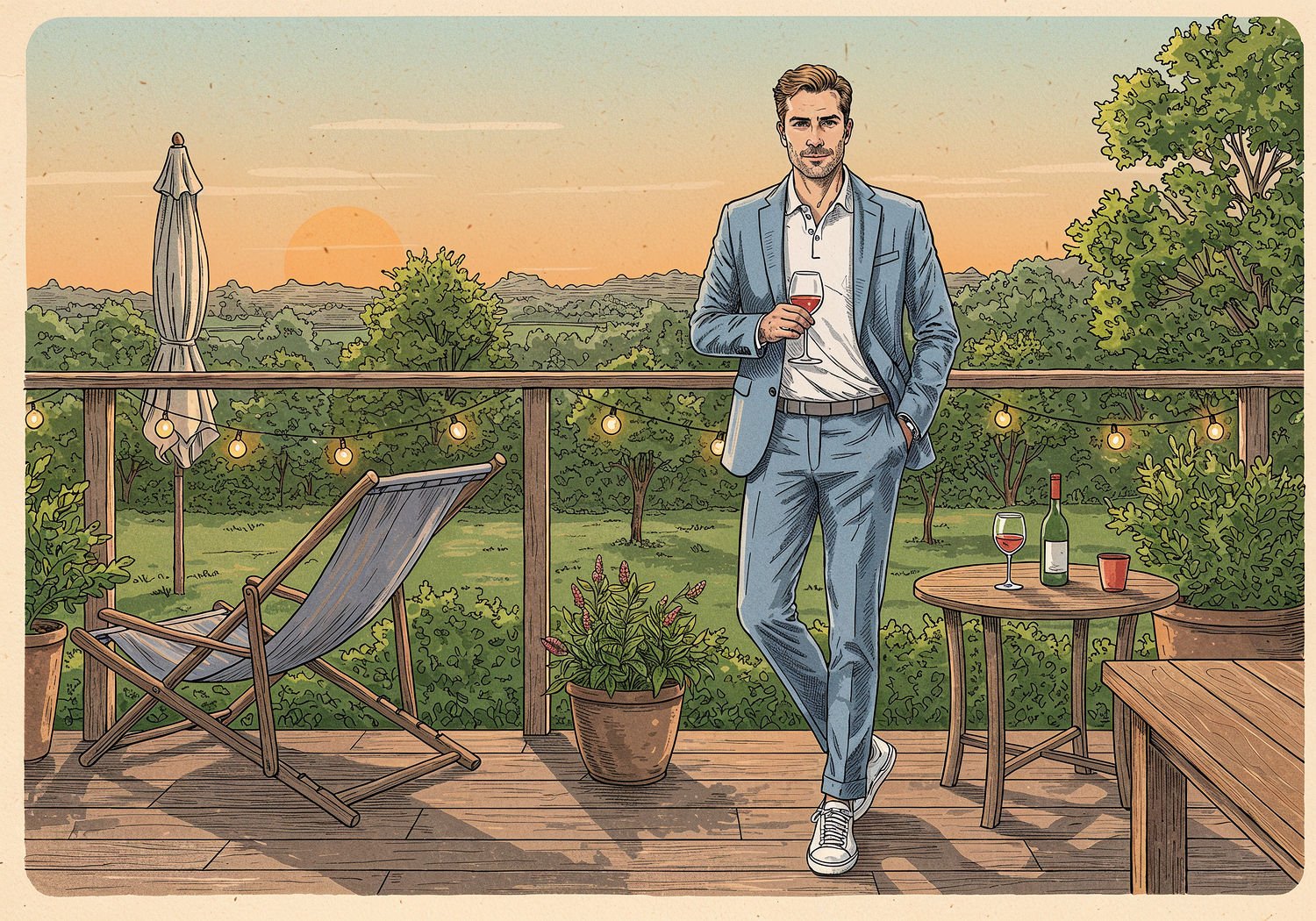 Traditional detailed engraving illustration with modern elements, etched lines, high contrast black and white, meticulous cross-hatching to create depth, printed on aged parchment paper of: Traditional detailed engraving illustration with modern elements, etched lines, high contrast black and white, meticulous cross-hatching to create depth, printed on aged parchment paper of: A man in his 30s standing relaxed on a wooden terrace at sunset, wearing a pastel blue casual slim-fit suit jacket unbuttoned with one button, matching slim trousers tapered at the ankles, a white slim-fit polo shirt partially tucked in with the top button undone, and white low-top canvas sneakers; he holds a glass of wine, overlooking a green garden with lounge chairs and a table in the background, soft evening light casting warm glows. Illustration: copperplate etching texture, ink lines, dramatic shading, artistic style, deep focus, museum quality print with humorous twist. Illustration: copperplate etching texture, ink lines, dramatic shading, artistic style, deep focus, museum quality print with humorous twist.