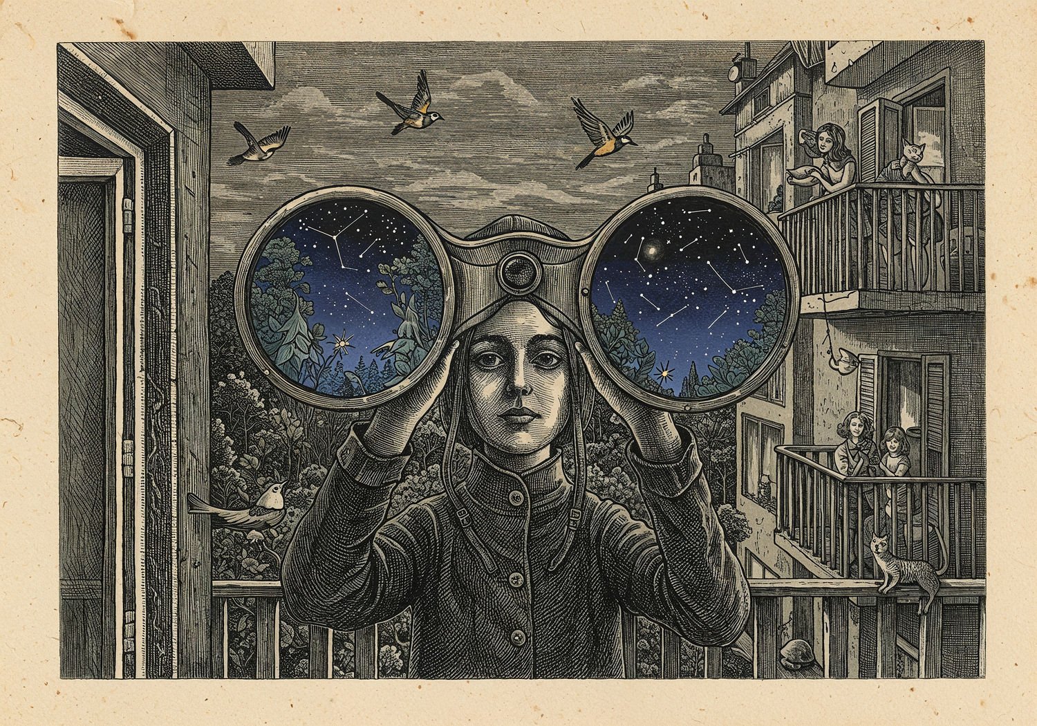 Traditional detailed engraving illustration, etched lines, high contrast black and white, meticulous cross-hatching to create depth, printed on aged parchment paper of: Traditional detailed engraving illustration, etched lines, high contrast black and white, meticulous cross-hatching to create depth, printed on aged parchment paper of: A person standing on a balcony at dusk, holding binoculars to their eyes, with three overlaid views through the lenses: in the foreground a vibrant forest scene with colorful birds flying among trees, in the middle a starry night sky with constellations, and in the background a neighboring apartment balcony with people chatting and a cat on the railing, all connected by the binoculars’ frame. Illustration: copperplate etching texture, ink lines, dramatic shading, art style inspired by Gustave Doré and Albrecht Dürer, deep focus, museum quality print. Illustration: copperplate etching texture, ink lines, dramatic shading, art style inspired by Gustave Doré and Albrecht Dürer, deep focus, museum quality print.