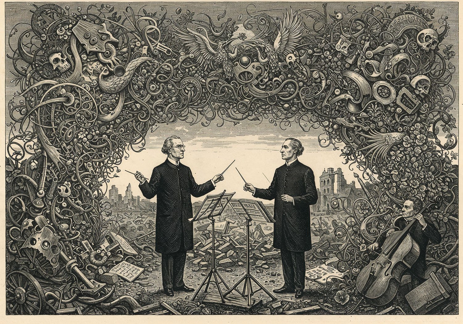 Traditional detailed engraving illustration with modern elements, etched lines, high contrast black and white, meticulous cross-hatching to create depth, printed on aged parchment paper of: Traditional detailed engraving illustration with modern elements, etched lines, high contrast black and white, meticulous cross-hatching to create depth, printed on aged parchment paper of: Two composers, Witold Lutosławski and Krzysztof Penderecki, standing side by side in a shadowy post-war Polish landscape with ruined buildings and faint Holocaust memorials in the background, conducting swirling masses of chaotic musical notes and sound waves that explode outward like emotional symphonies, forming dense clusters, glissandi, and aleatory patterns from abstract string instruments and orchestral elements, transforming into symbols of rebirth such as rising phoenixes and blooming vines amidst the debris, evoking trauma, innovation, and universal harmony. Illustration: copperplate etching texture, ink lines, dramatic shading, artistic style, deep focus, museum quality print with humorous twist. Illustration: copperplate etching texture, ink lines, dramatic shading, artistic style, deep focus, museum quality print with humorous twist.