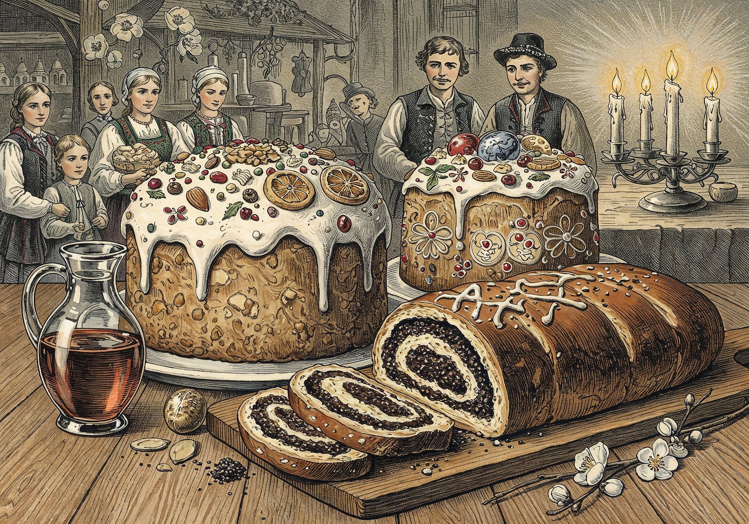 Traditional detailed engraving illustration, etched lines, high contrast black and white, meticulous cross-hatching to create depth, printed on aged parchment paper of: Traditional detailed engraving illustration, etched lines, high contrast black and white, meticulous cross-hatching to create depth, printed on aged parchment paper of: A festive Polish holiday scene on a wooden table laden with a freshly sliced makowiec poppy seed roll revealing its rich, dark filling of ground poppy seeds, honey, and nuts, placed beside an elaborately decorated mazurek flat cake topped with colorful icing patterns of crosses and eggs, scattered almonds, dried fruits, and chocolate accents; in the background, a family from different eras gathers around, including figures in traditional 17th-century attire sharing slices, with subtle symbolic elements like blooming poppy flowers representing fertility and protection, flickering Advent candles for Christmas, and spring blossoms for Easter, evoking a sense of historical tradition and generational connection. Illustration: copperplate etching texture, ink lines, dramatic shading, art style inspired by Gustave Doré and Albrecht Dürer, deep focus, museum quality print. Illustration: copperplate etching texture, ink lines, dramatic shading, art style inspired by Gustave Doré and Albrecht Dürer, deep focus, museum quality print.