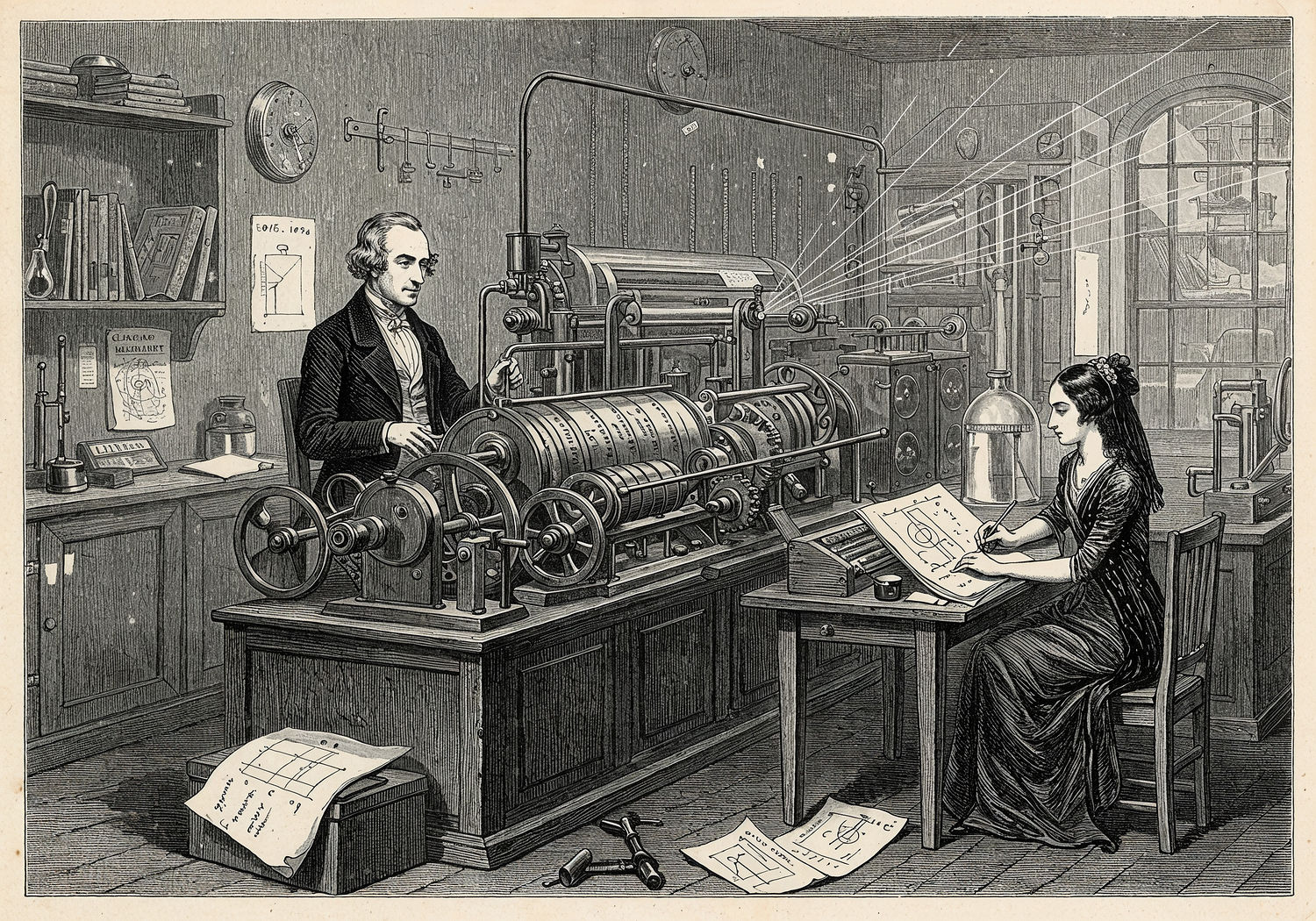 Traditional detailed engraving illustration with modern elements, etched lines, high contrast black and white, meticulous cross-hatching to create depth, printed on aged parchment paper of: Traditional detailed engraving illustration with modern elements, etched lines, high contrast black and white, meticulous cross-hatching to create depth, printed on aged parchment paper of: Charles Babbage examining a large mechanical Analytical Engine with brass gears, wheels, levers, and perforated cards for programming, Ada Lovelace seated nearby writing notes on a desk with mathematical diagrams, stacks of census data papers scattered around, a 19th-century workshop setting with tools and blueprints, subtle overlay of modern computer circuits and data streams emerging from the machine. Illustration: copperplate etching texture, ink lines, dramatic shading, artistic style, deep focus, museum quality print with humorous twist. Illustration: copperplate etching texture, ink lines, dramatic shading, artistic style, deep focus, museum quality print with humorous twist.