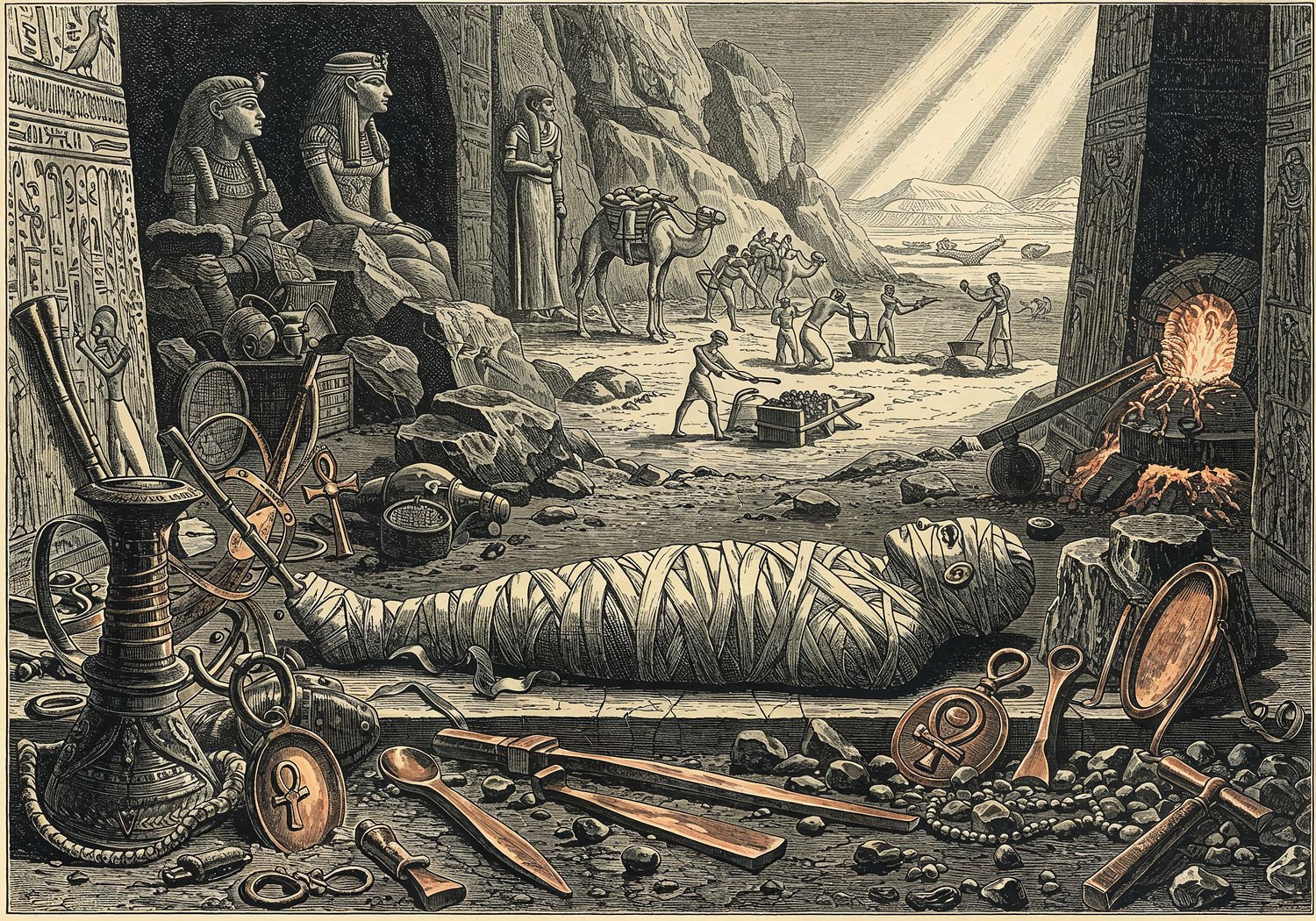 Traditional detailed engraving illustration with modern elements, etched lines, high contrast black and white, meticulous cross-hatching to create depth, printed on aged parchment paper of: Traditional detailed engraving illustration with modern elements, etched lines, high contrast black and white, meticulous cross-hatching to create depth, printed on aged parchment paper of: Ancient Egyptian scene in a pharaoh’s tomb: a central mummy wrapped in linens adorned with copper amulets shaped like ankhs and scarabs, surrounded by copper tools including chisels, daggers, and mirrors placed as offerings; in the background, miners extracting malachite ore from rocky Sinai caves under Hathor temple statues, a caravan of camels carrying ore across desert dunes toward the Nile River, where workers smelt copper in clay furnaces with bellows, forging bronze blades on stone anvils; rays of sunlight illuminate symbolic elements like Osiris figure with copper skin tone and hieroglyphs invoking eternal life on tomb walls. Illustration: copperplate etching texture, ink lines, dramatic shading, artistic style, deep focus, museum quality print with humorous twist. Illustration: copperplate etching texture, ink lines, dramatic shading, artistic style, deep focus, museum quality print with humorous twist.