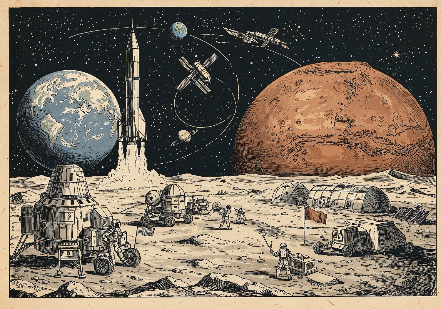 Traditional detailed engraving illustration with modern elements, etched lines, high contrast black and white, meticulous cross-hatching to create depth, printed on aged parchment paper of: Traditional detailed engraving illustration with modern elements, etched lines, high contrast black and white, meticulous cross-hatching to create depth, printed on aged parchment paper of: A futuristic scene of human space exploration: a massive reusable Starship rocket launching from Earth towards Mars, with the Moon in the foreground featuring a lunar base camp with habitats, rovers, and astronauts working on icy regolith; in the background, the red planet Mars shows a landing site with modular domes, solar panels, and a crew planting a flag, while a distant view includes the International Space Station orbiting Earth and conceptual paths extending to outer planets like Jupiter; elements of challenges like radiation shields on spacecraft and resource extraction equipment on Mars surface. Illustration: copperplate etching texture, ink lines, dramatic shading, artistic style, deep focus, museum quality print with humorous twist. Illustration: copperplate etching texture, ink lines, dramatic shading, artistic style, deep focus, museum quality print with humorous twist.