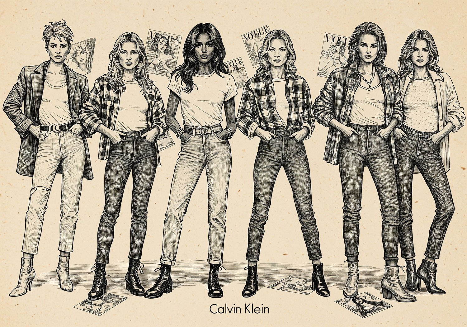 Traditional detailed engraving illustration with modern elements, etched lines, high contrast black and white, meticulous cross-hatching to create depth, printed on aged parchment paper of: Traditional detailed engraving illustration with modern elements, etched lines, high contrast black and white, meticulous cross-hatching to create depth, printed on aged parchment paper of: A group of iconic 90s supermodels including Naomi Campbell, Cindy Crawford, Kate Moss, and Linda Evangelista standing confidently on a minimalist runway, dressed in simple white T-shirts, slim jeans, flannel shirts, and oversized sweaters, with subtle grunge elements like Doc Martens boots and subtle natural makeup, surrounded by clean neutral backgrounds contrasting faint shadowy hints of 80s excess like glittering shoulder pads and bold patterns in the distance, Vogue magazine covers floating nearby, and a central Calvin Klein logo subtly integrated into the scene. Illustration: copperplate etching texture, ink lines, dramatic shading, artistic style, deep focus, museum quality print with humorous twist. Illustration: copperplate etching texture, ink lines, dramatic shading, artistic style, deep focus, museum quality print with humorous twist.