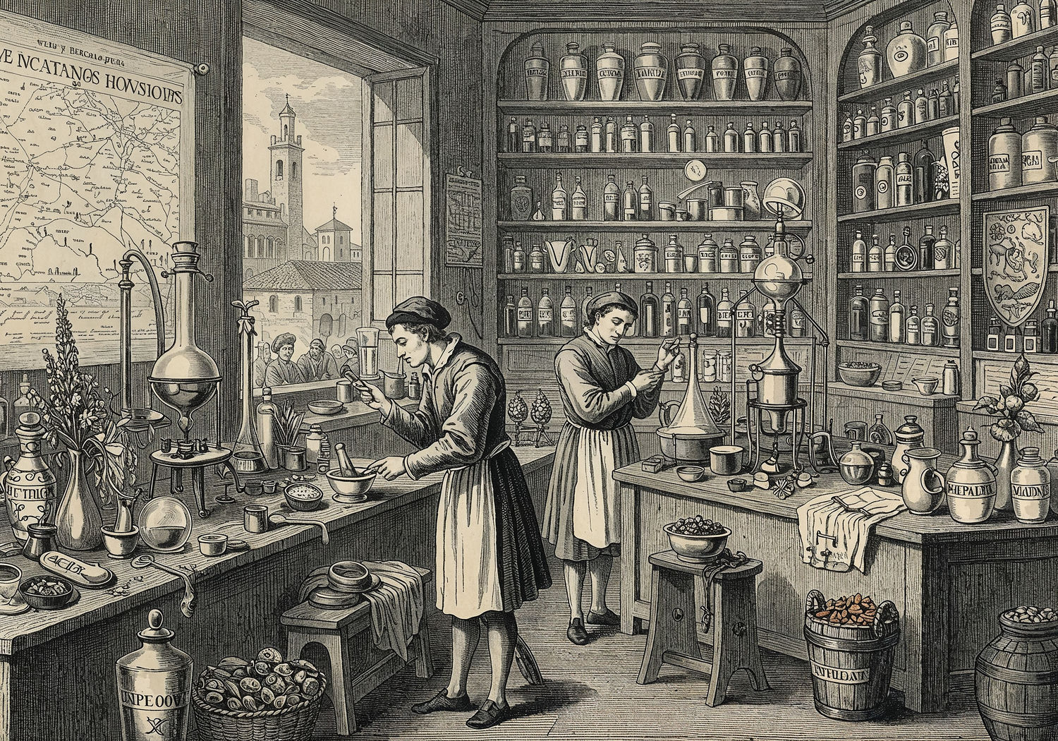 Traditional detailed engraving illustration with modern elements, etched lines, high contrast black and white, meticulous cross-hatching to create depth, printed on aged parchment paper of: Traditional detailed engraving illustration with modern elements, etched lines, high contrast black and white, meticulous cross-hatching to create depth, printed on aged parchment paper of: A bustling Renaissance apothecary workshop in 16th-century Florence, with two apothecaries in period attire mixing herbal ointments and tonics on wooden tables cluttered with glass vials, mortars, pestles, exotic ingredients like saffron and henna, and alchemical distillation apparatus; shelves lined with labeled jars of creams and elixirs bearing guild seals; in the background, a window overlooking the Piazza della Signoria with merchants trading spices, and a map of trade routes to the East on the wall. Illustration: copperplate etching texture, ink lines, dramatic shading, artistic style, deep focus, museum quality print with humorous twist. Illustration: copperplate etching texture, ink lines, dramatic shading, artistic style, deep focus, museum quality print with humorous twist.