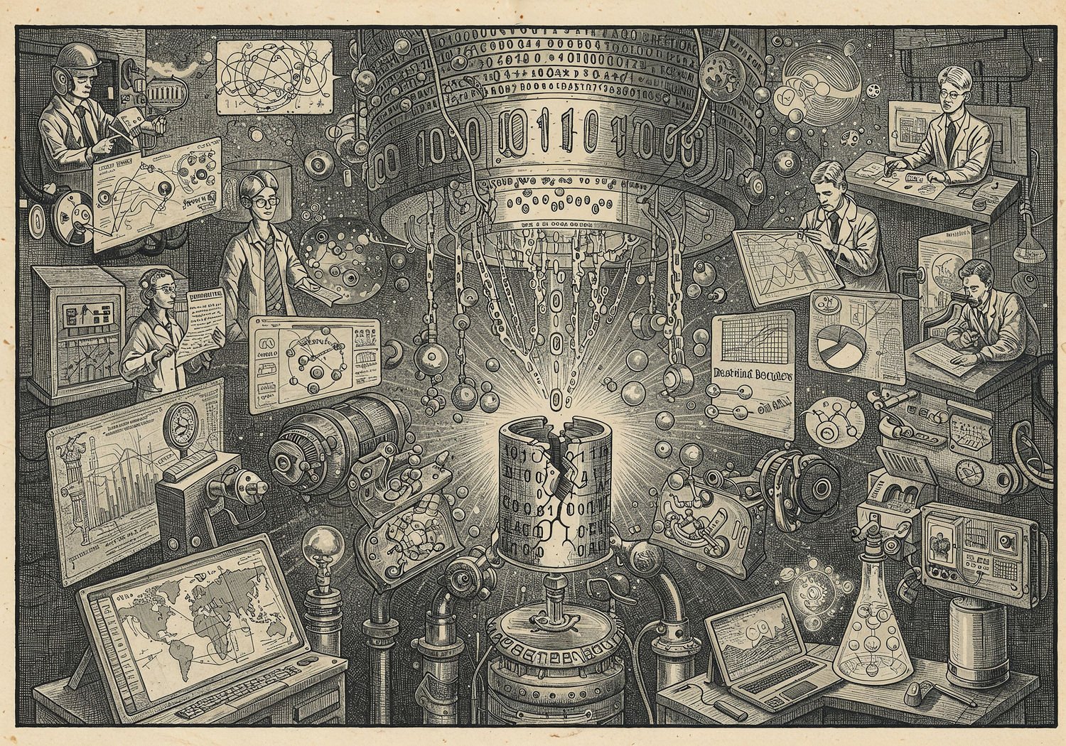 Traditional detailed engraving illustration with modern elements, etched lines, high contrast black and white, meticulous cross-hatching to create depth, printed on aged parchment paper of: Traditional detailed engraving illustration with modern elements, etched lines, high contrast black and white, meticulous cross-hatching to create depth, printed on aged parchment paper of: A futuristic quantum computer at the center, with glowing qubits in superposition represented as overlapping zero and one symbols, entangled particles connected by ethereal links across distances, a cracked cryptographic lock symbolizing Shor’s algorithm breaking RSA codes, molecular structures of chemicals and drugs being simulated with atomic interactions, a diverse group of scientists analyzing data on holographic displays showing medical breakthroughs and new materials, all set against a backdrop of transforming global industries from finance to healthcare. Illustration: copperplate etching texture, ink lines, dramatic shading, artistic style, deep focus, museum quality print with humorous twist. Illustration: copperplate etching texture, ink lines, dramatic shading, artistic style, deep focus, museum quality print with humorous twist.