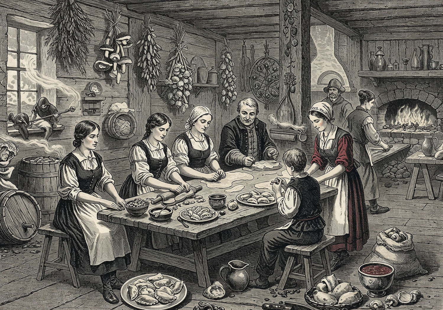 Traditional detailed engraving illustration, etched lines, high contrast black and white, meticulous cross-hatching to create depth, printed on aged parchment paper of: Traditional detailed engraving illustration, etched lines, high contrast black and white, meticulous cross-hatching to create depth, printed on aged parchment paper of: A traditional Polish Christmas Eve scene in a warmly lit rustic kitchen, with a family of multiple generations gathered around a wooden table kneading dough and filling pierogi with a mixture of sauerkraut, chopped forest mushrooms, and groats. Nearby, open barrels of fermenting cabbage, bundles of dried mushrooms hanging from the ceiling, and sacks of grains; in the background, a historical vignette showing medieval pâtés being baked in an oven, blending past and present traditions. Steaming plates of cooked pierogi and uszka served with red borscht, surrounded by symbolic elements like a Advent wreath and family sharing stories. Illustration: copperplate etching texture, ink lines, dramatic shading, art style inspired by Gustave Doré and Albrecht Dürer, deep focus, museum quality print. Illustration: copperplate etching texture, ink lines, dramatic shading, art style inspired by Gustave Doré and Albrecht Dürer, deep focus, museum quality print.