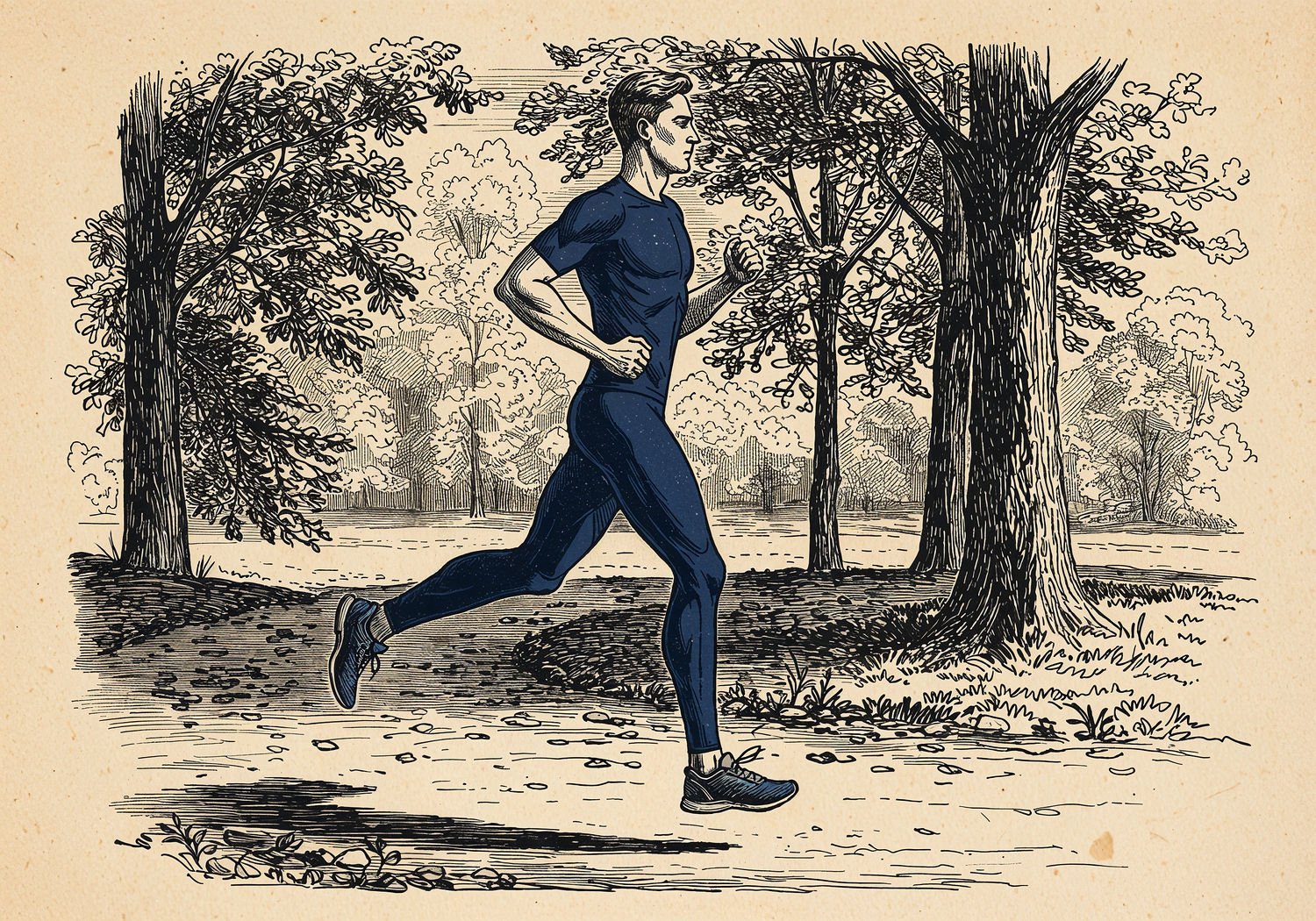 Traditional detailed engraving illustration with modern elements, etched lines, high contrast black and white, meticulous cross-hatching to create depth, printed on aged parchment paper of: Traditional detailed engraving illustration with modern elements, etched lines, high contrast black and white, meticulous cross-hatching to create depth, printed on aged parchment paper of: A fit runner with an athletic build, wearing a tight-fitting navy blue compression t-shirt that highlights the V-shaped torso and defined chest and abs, paired with matching navy blue compression leggings that accentuate the quadriceps and calves, and lightweight black sports shoes, jogging dynamically along a tree-lined park path with green foliage and sunlight filtering through leaves in the background. Illustration: copperplate etching texture, ink lines, dramatic shading, artistic style, deep focus, museum quality print with humorous twist. Illustration: copperplate etching texture, ink lines, dramatic shading, artistic style, deep focus, museum quality print with humorous twist.