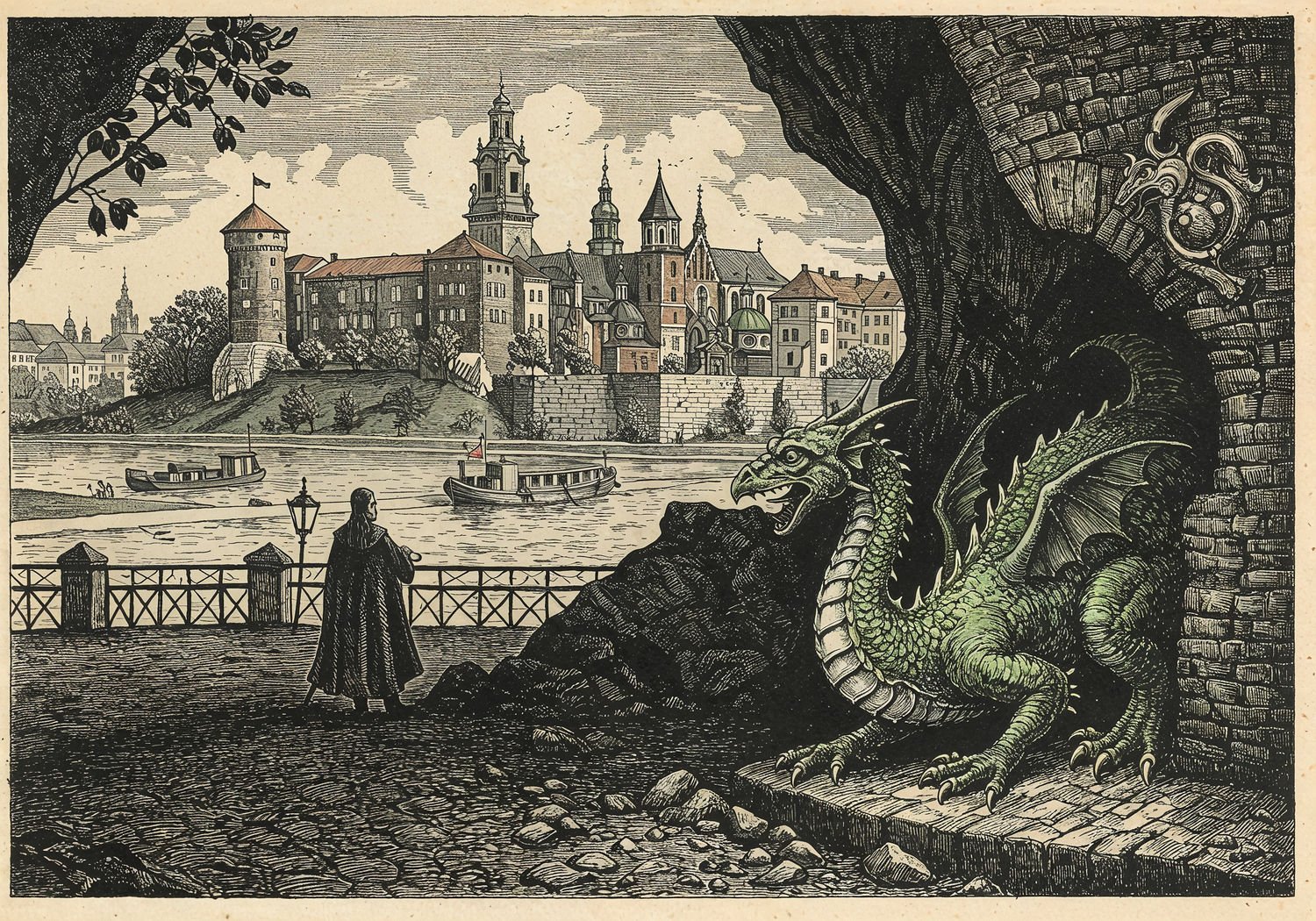 Traditional detailed engraving illustration with modern elements, etched lines, high contrast black and white, meticulous cross-hatching to create depth, printed on aged parchment paper of: Traditional detailed engraving illustration with modern elements, etched lines, high contrast black and white, meticulous cross-hatching to create depth, printed on aged parchment paper of: A majestic green-scaled dragon emerging from a dark cave entrance under Wawel Castle in Krakow, with the castle’s towers and walls visible above on a hilltop, the Vistula River flowing nearby under a medieval bridge, subtle dragon motifs carved on nearby stones, and a distant view of the bustling Main Market Square with Sukiennice and St. Mary’s Basilica in the background, evoking a sense of ancient legend and urban exploration. Illustration: copperplate etching texture, ink lines, dramatic shading, artistic style, deep focus, museum quality print with humorous twist. Illustration: copperplate etching texture, ink lines, dramatic shading, artistic style, deep focus, museum quality print with humorous twist.
