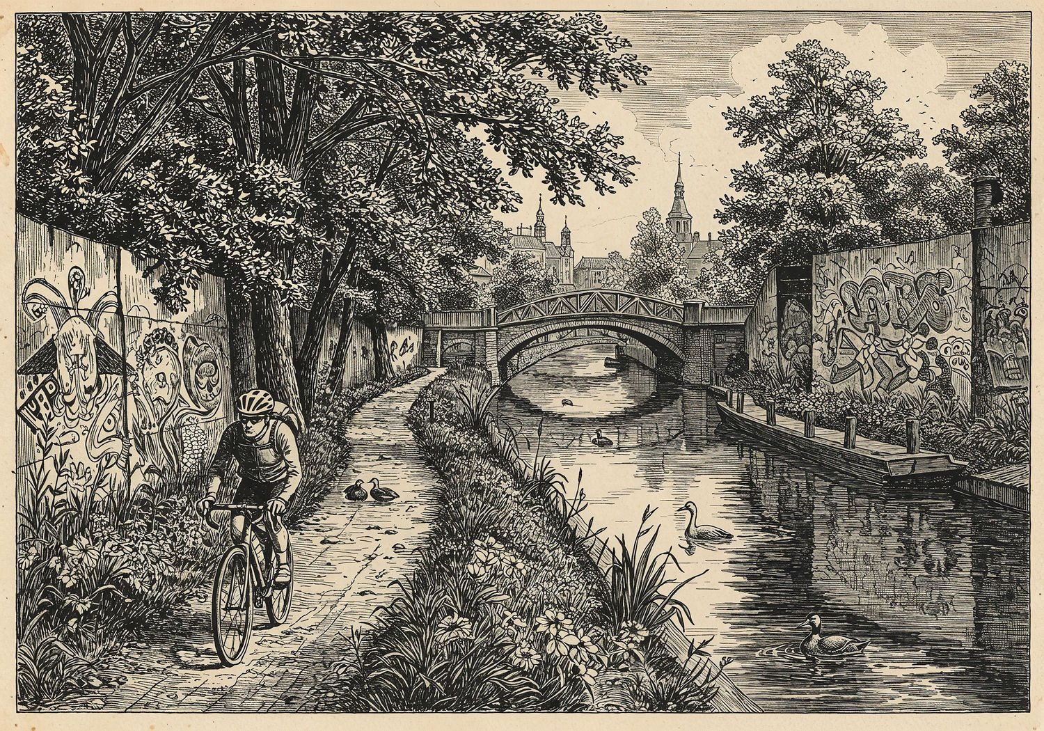 Traditional detailed engraving illustration with modern elements, etched lines, high contrast black and white, meticulous cross-hatching to create depth, printed on aged parchment paper of: Traditional detailed engraving illustration with modern elements, etched lines, high contrast black and white, meticulous cross-hatching to create depth, printed on aged parchment paper of: A cyclist riding a gravel bike along a narrow, tree-lined path beside a calm canal in Wrocław, with the Oder River visible in the background, old industrial bridges arching over the water, herons and ducks on the water’s edge, vibrant street art murals on nearby concrete walls, lush green islands and wildflowers surrounding the scene, evoking a sense of hidden exploration and peaceful adventure. Illustration: copperplate etching texture, ink lines, dramatic shading, artistic style, deep focus, museum quality print with humorous twist. Illustration: copperplate etching texture, ink lines, dramatic shading, artistic style, deep focus, museum quality print with humorous twist.