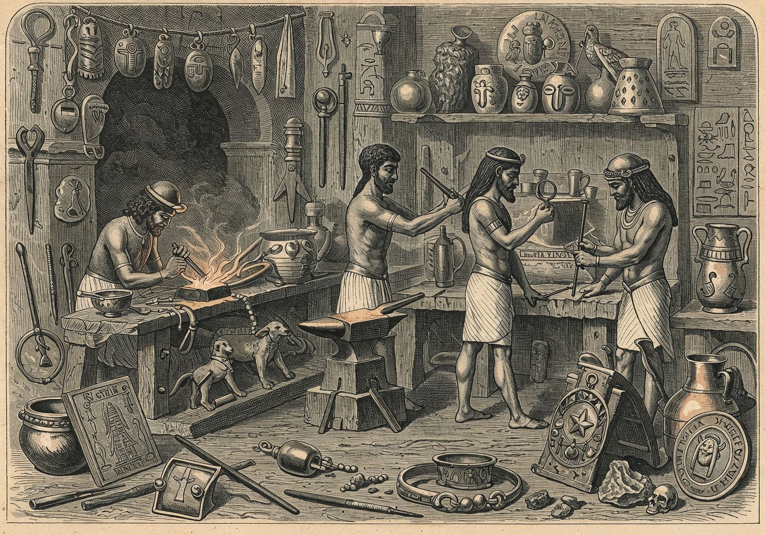 Traditional detailed engraving illustration with modern elements, etched lines, high contrast black and white, meticulous cross-hatching to create depth, printed on aged parchment paper of: Traditional detailed engraving illustration with modern elements, etched lines, high contrast black and white, meticulous cross-hatching to create depth, printed on aged parchment paper of: Ancient Bronze Age scene in a Mesopotamian and Egyptian workshop, showing artisans smelting bronze in clay furnaces, forging thin metal sheets into bracelets and amulets on anvils, engraving intricate motifs of scarabs, lions, stars, Anubis, and Inanna with stone tools, inlaying lapis lazuli and gold into pectorals and necklaces, with finished ornaments worn by elites, warriors, and common people including simple pendants and elaborate collars, surrounded by tools, raw copper and tin ores, and symbolic artifacts like hieroglyphic rings and repoussé plaques. Illustration: copperplate etching texture, ink lines, dramatic shading, artistic style, deep focus, museum quality print with humorous twist. Illustration: copperplate etching texture, ink lines, dramatic shading, artistic style, deep focus, museum quality print with humorous twist.