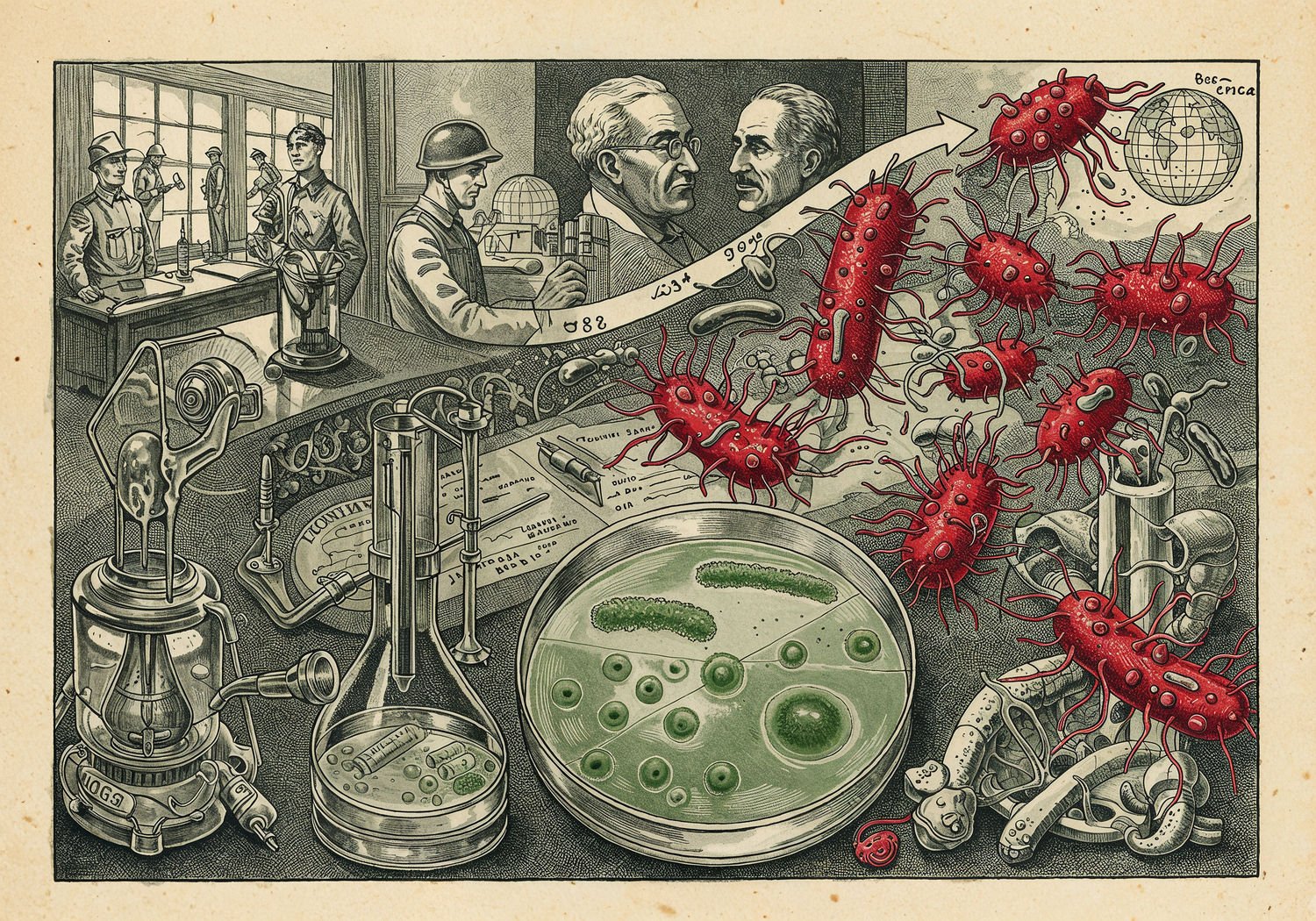 Traditional detailed engraving illustration with modern elements, etched lines, high contrast black and white, meticulous cross-hatching to create depth, printed on aged parchment paper of: Traditional detailed engraving illustration with modern elements, etched lines, high contrast black and white, meticulous cross-hatching to create depth, printed on aged parchment paper of: A laboratory scene from 1928 showing Alexander Fleming examining a Petri dish with green Penicillium mold growing in the center, surrounded by a clear zone where Staphylococcus aureus bacteria colonies are absent, while in the background, faint silhouettes depict WWII soldiers being treated with penicillin injections, modern hospital patients fighting superbugs represented as menacing red bacterial clusters breaking through antibiotic barriers, and a timeline arrow connecting the discovery to a future crisis with global maps highlighting antibiotic resistance hotspots. Illustration: copperplate etching texture, ink lines, dramatic shading, artistic style, deep focus, museum quality print with humorous twist. Illustration: copperplate etching texture, ink lines, dramatic shading, artistic style, deep focus, museum quality print with humorous twist.