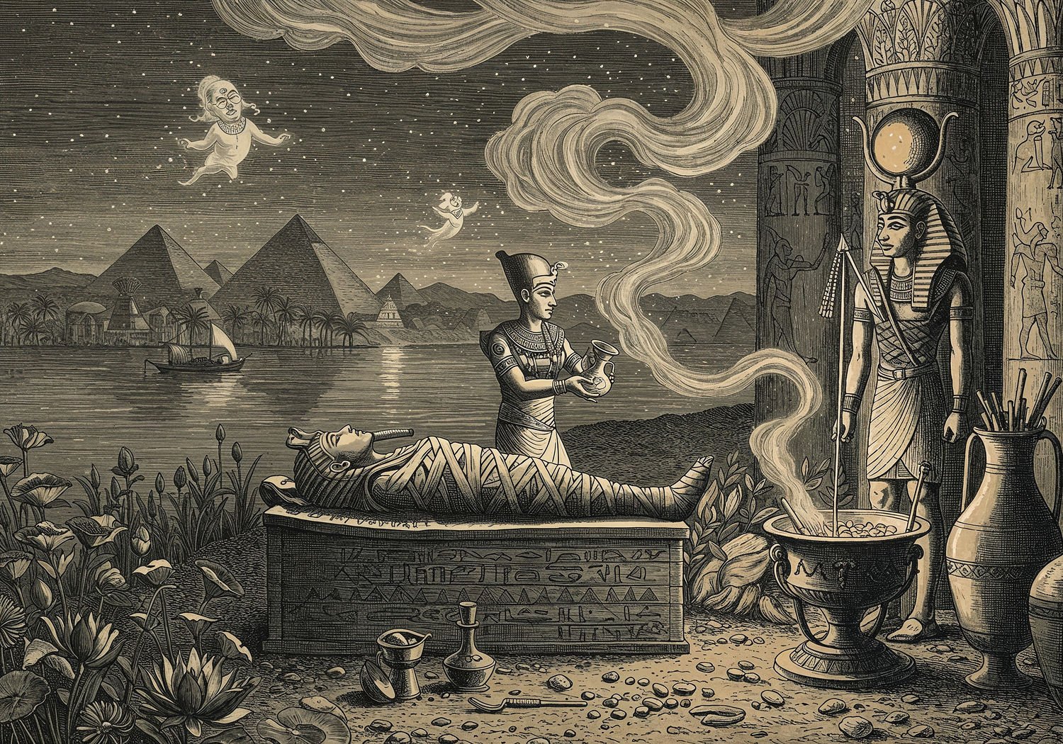 Traditional detailed engraving illustration with modern elements, etched lines, high contrast black and white, meticulous cross-hatching to create depth, printed on aged parchment paper of: Traditional detailed engraving illustration with modern elements, etched lines, high contrast black and white, meticulous cross-hatching to create depth, printed on aged parchment paper of: Ancient Egyptian scene in a grand temple along the Nile River, where a pharaoh adorned with a nemes headdress stands before a sarcophagus containing a mummified body, a priest pouring aromatic oils from an alabaster vessel onto the mummy, lotus flowers blooming in the foreground near the riverbank, chunks of golden myrrh resin burning in a censer releasing swirling incense smoke that ascends toward the starry sky with silhouettes of pyramids and the god Osiris watching over, ethereal souls or ka spirits floating upward amid the vapors. Illustration: copperplate etching texture, ink lines, dramatic shading, artistic style, deep focus, museum quality print with humorous twist. Illustration: copperplate etching texture, ink lines, dramatic shading, artistic style, deep focus, museum quality print with humorous twist.
