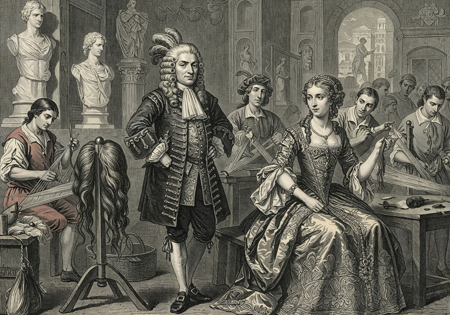 Traditional detailed engraving illustration with modern elements, etched lines, high contrast black and white, meticulous cross-hatching to create depth, printed on aged parchment paper of: Traditional detailed engraving illustration with modern elements, etched lines, high contrast black and white, meticulous cross-hatching to create depth, printed on aged parchment paper of: A Renaissance Italian court scene in Florence, featuring a nobleman and a noblewoman from the Medici family standing elegantly in ornate attire, the man wearing a luxurious curled wig adorned with gold threads and pearls, the woman with flowing locks in a peruke styled alla greca with jewels, surrounded by artisans weaving human hair wigs on silk nets, with subtle background elements of ancient sculptures and a bustling workshop, evoking prestige, craftsmanship, and social hierarchy. Illustration: copperplate etching texture, ink lines, dramatic shading, artistic style, deep focus, museum quality print with humorous twist. Illustration: copperplate etching texture, ink lines, dramatic shading, artistic style, deep focus, museum quality print with humorous twist.