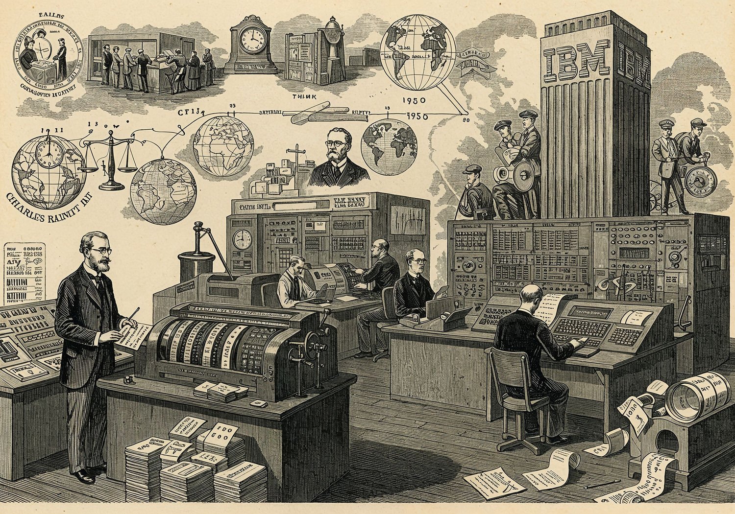 Traditional detailed engraving illustration with modern elements, etched lines, high contrast black and white, meticulous cross-hatching to create depth, printed on aged parchment paper of: Traditional detailed engraving illustration with modern elements, etched lines, high contrast black and white, meticulous cross-hatching to create depth, printed on aged parchment paper of: A historical scene depicting the evolution of IBM: in the foreground, Herman Hollerith standing beside a mechanical tabulating machine processing punched cards during the 1890 US census, with stacks of rectangular punched cards showing perforations for data like names and ages; in the midground, the 1911 founding of CTR with Charles Ranlett Flint overseeing the merger of three companies represented by icons of time clocks, scales, and tabulators; in the background, Thomas J. Watson Sr. at a desk with the „THINK” motto, surrounded by expanding global maps showing exports to Europe and beyond, leading to a towering IBM logo emerging from a massive data processing system with sorters, calculators, and rolls of printed output; subtle elements include diverse workers operating keypunch machines and a timeline arrow from 1880 to 1950 illustrating growth from mechanical innovation to corporate dominance. Illustration: copperplate etching texture, ink lines, dramatic shading, artistic style, deep focus, museum quality print with humorous twist. Illustration: copperplate etching texture, ink lines, dramatic shading, artistic style, deep focus, museum quality print with humorous twist.