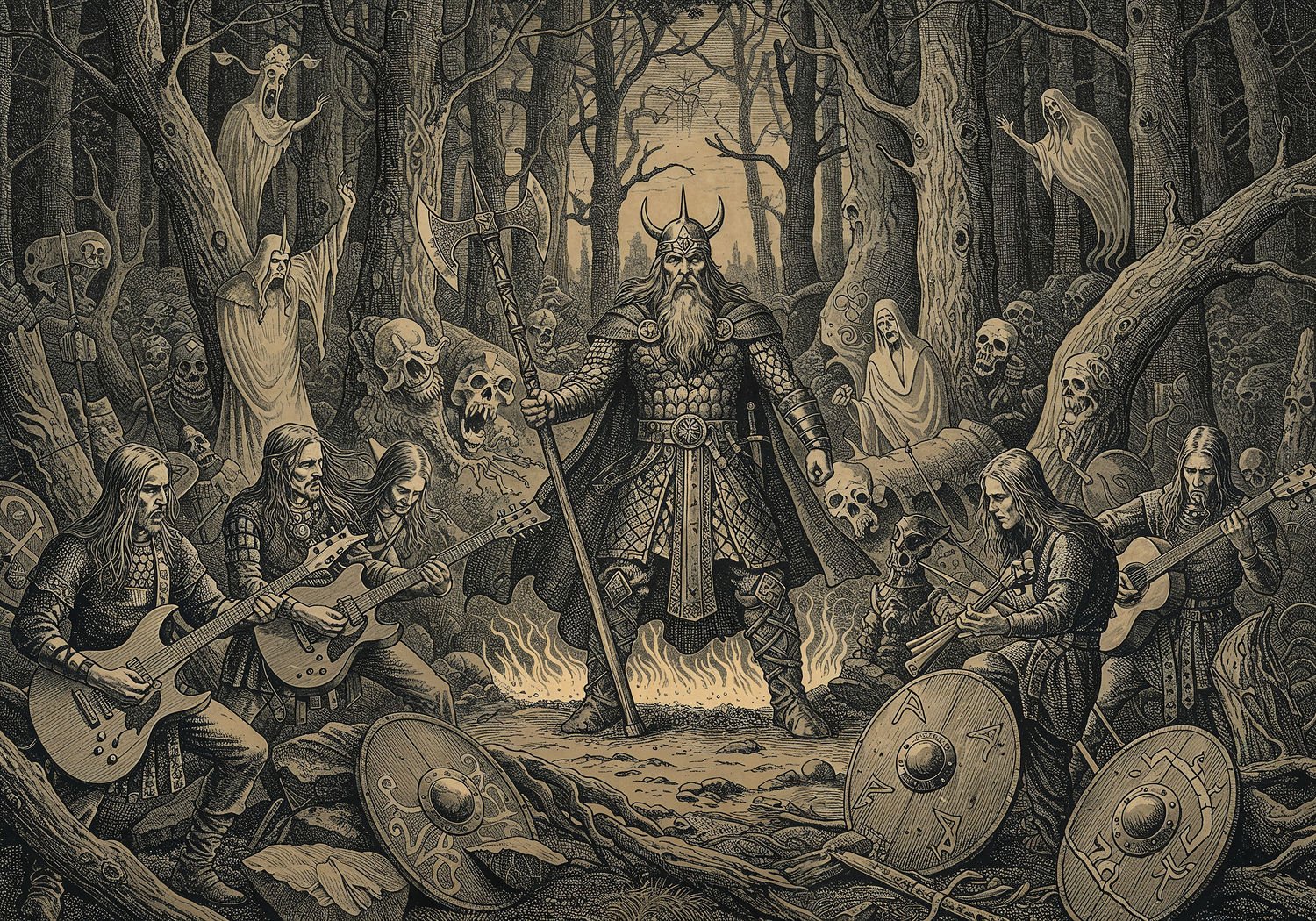 Traditional detailed engraving illustration with modern elements, etched lines, high contrast black and white, meticulous cross-hatching to create depth, printed on aged parchment paper of: Traditional detailed engraving illustration with modern elements, etched lines, high contrast black and white, meticulous cross-hatching to create depth, printed on aged parchment paper of: A fierce Slavic warrior god like Perun wielding a thunderbolt axe stands amidst a dense ancient forest, surrounded by ethereal spirits such as leshy and rusalki emerging from misty trees, while in the foreground a group of musicians plays heavy distorted guitars intertwined with folk instruments like bagpipes and hurdy-gurdy, evoking a battle scene from Grunwald with shields and runes scattered on the ground, flames and shadows blending metal intensity with pagan rituals. Illustration: copperplate etching texture, ink lines, dramatic shading, artistic style, deep focus, museum quality print with humorous twist. Illustration: copperplate etching texture, ink lines, dramatic shading, artistic style, deep focus, museum quality print with humorous twist.