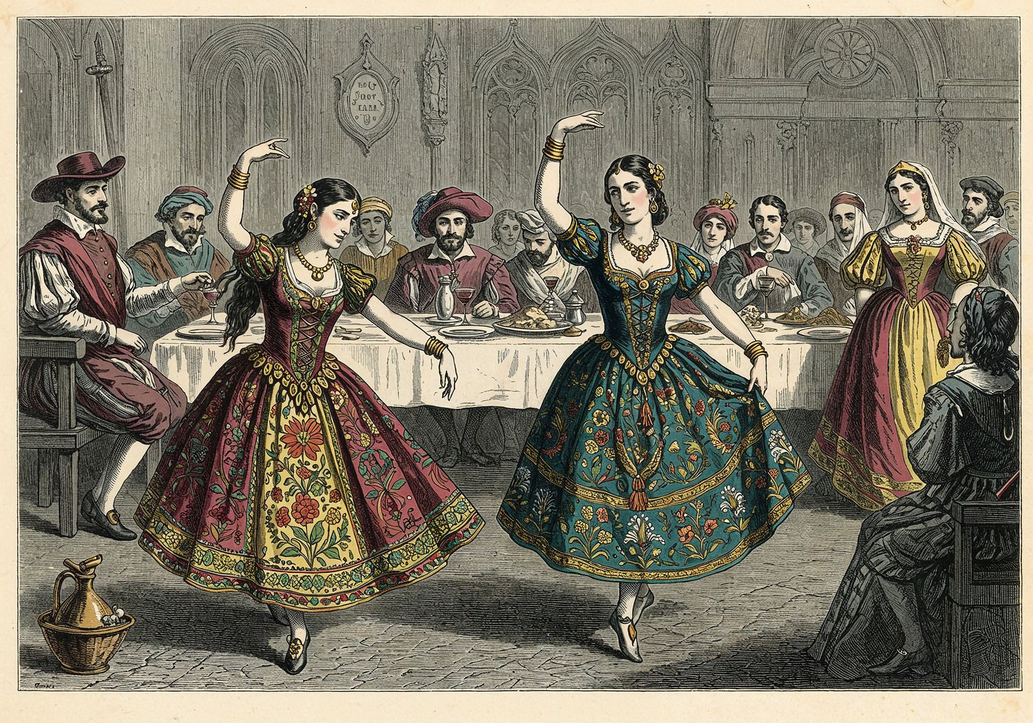 Dworskie uczty za panowania Manuela I były kwintesencją portugalskiej potęgi, a tancerki odgrywały w nich centralną rolę. Te kobiety, często z niższej arystokracji lub nawet z kolonii (jak mulatki z Indii czy Brazylii), ubrane w egzotyczne stroje, dodawały kolorytu nudnym ceremoniom. Ich garderoba ewoluowała dzięki importom: suknie z indyjskiego jedwabiu, z wycięciami eksponującymi skórę opalona słońcem kolonii, emanowały zmysłowością. Podczas uczt w pałacu Alcáçova, gdzie serwowano potrawy z przypraw indyjskich, tancerki wykonywały choreografie inspirowane tańcami z Goa czy brazylijskimi rituais tubylczych.