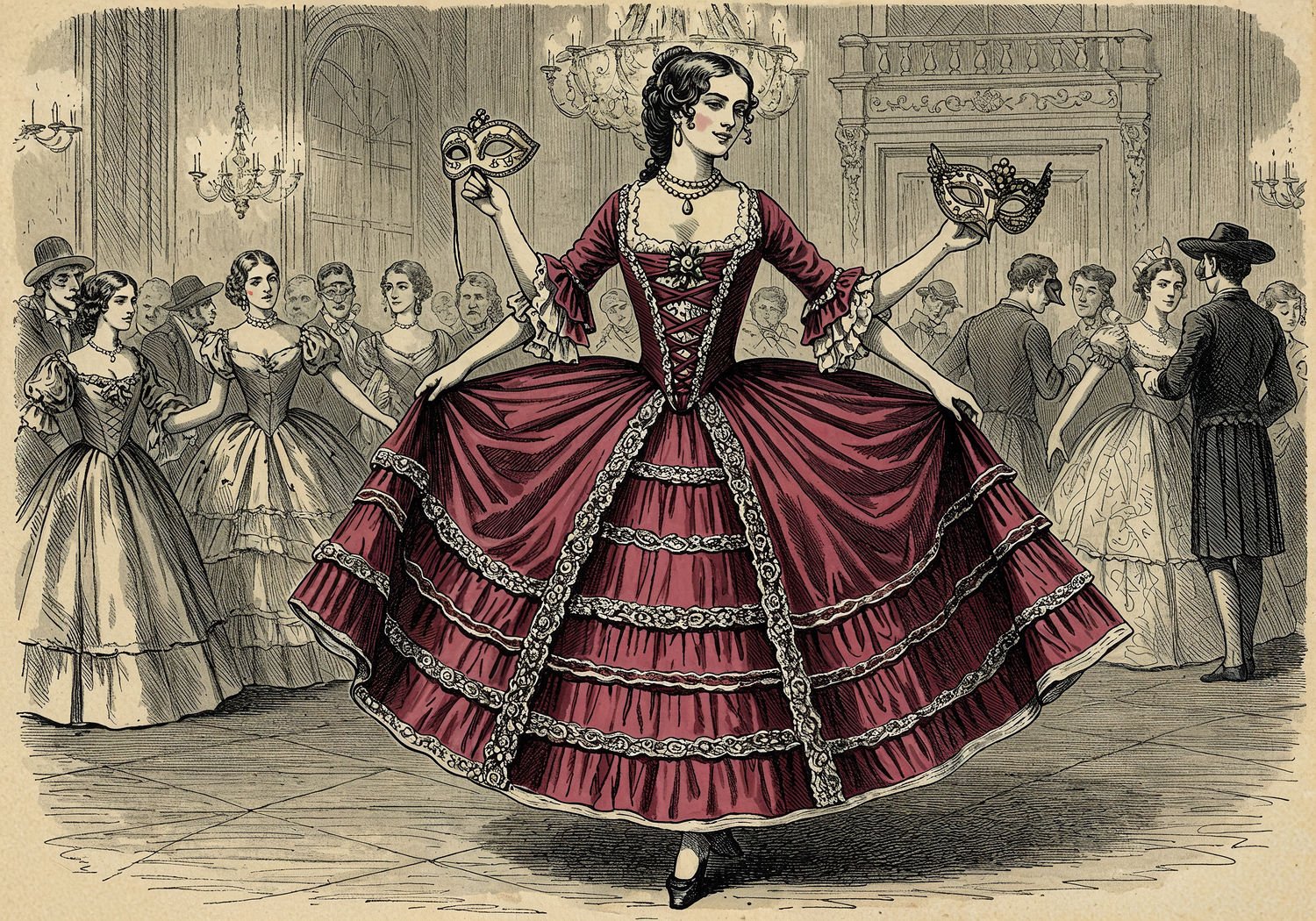 Maskarady w XVIII-wiecznej Portugalii, organizowane w pałacach Lizbony czy Porto, były kulminacją życia towarzyskiego. To tam rokoko objawiało się w pełni, z tańcami od powolnych gavotte po żywiołowe fado wczesne, choć fado rozwinęło się później. Tancerki, często maskowane weneckimi maschere, nosiły stroje zaprojektowane z myślą o ruchu. Falbaniaste spódnice były kluczowe: ich warstwowa konstrukcja, z zewnętrzną warstwą z lekkiego jedwabiu i wewnętrzną z muślinu, pozwalała na wirujące obroty bez utraty formy. Na przykład podczas contredanse, tańca grupowego, falbany rozkładały się jak wachlarze, podkreślając rytm i grację.