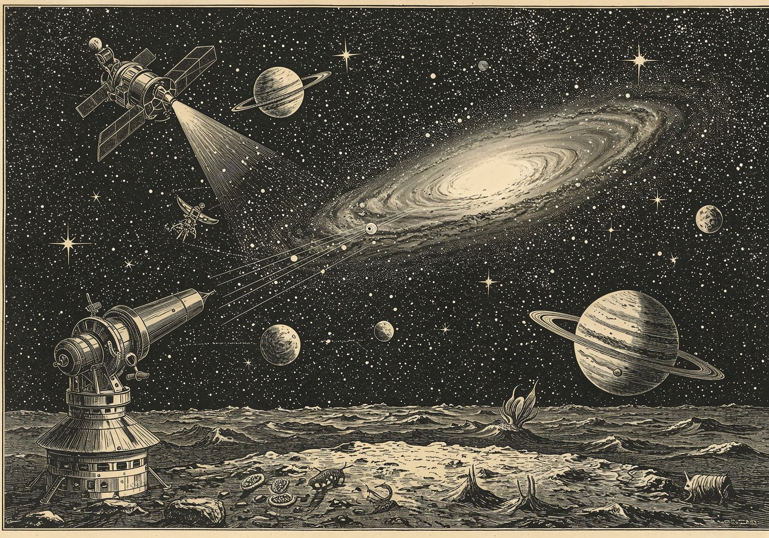 Traditional detailed engraving illustration with modern elements, etched lines, high contrast black and white, meticulous cross-hatching to create depth, printed on aged parchment paper of: Traditional detailed engraving illustration with modern elements, etched lines, high contrast black and white, meticulous cross-hatching to create depth, printed on aged parchment paper of: A cosmic scene featuring the Kepler and TESS space telescopes floating in orbit around Earth, beaming data towards a vibrant Milky Way galaxy filled with thousands of stars; in the foreground, a rocky exoplanet similar to Earth transits in front of a Sun-like star, revealing its thin atmosphere with traces of water vapor, oxygen, and methane; subtle hints of potential life like microbial forms on the planet’s surface and orbiting moons; distant gas giants and super-Earths visible around other stars, with light curves and spectral lines overlaying the transit to illustrate detection methods. Illustration: copperplate etching texture, ink lines, dramatic shading, artistic style, deep focus, museum quality print with humorous twist. Illustration: copperplate etching texture, ink lines, dramatic shading, artistic style, deep focus, museum quality print with humorous twist.