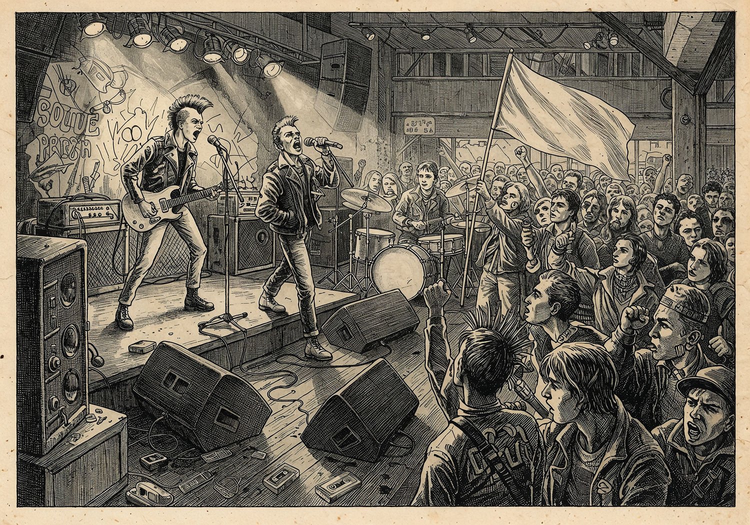 Traditional detailed engraving illustration with modern elements, etched lines, high contrast black and white, meticulous cross-hatching to create depth, printed on aged parchment paper of: Traditional detailed engraving illustration with modern elements, etched lines, high contrast black and white, meticulous cross-hatching to create depth, printed on aged parchment paper of: A gritty underground concert in a dimly lit Polish club during the 1980s, with a punk band on stage featuring a charismatic male vocalist in a leather jacket shouting into a microphone connected to a distorted electric guitar, a female singer nearby gripping a synthesizer, and a drummer pounding fast rhythms; in the foreground, a diverse crowd of young rebels in torn clothes and safety pins raising fists and waving a white flag as a symbol of ironic protest; background shows gray concrete communist-era buildings with empty shop shelves and distant military tanks under overcast skies, queues of people waiting in line, and subtle elements like cassette tapes scattered on the floor representing underground distribution. Illustration: copperplate etching texture, ink lines, dramatic shading, artistic style, deep focus, museum quality print with humorous twist. Illustration: copperplate etching texture, ink lines, dramatic shading, artistic style, deep focus, museum quality print with humorous twist.