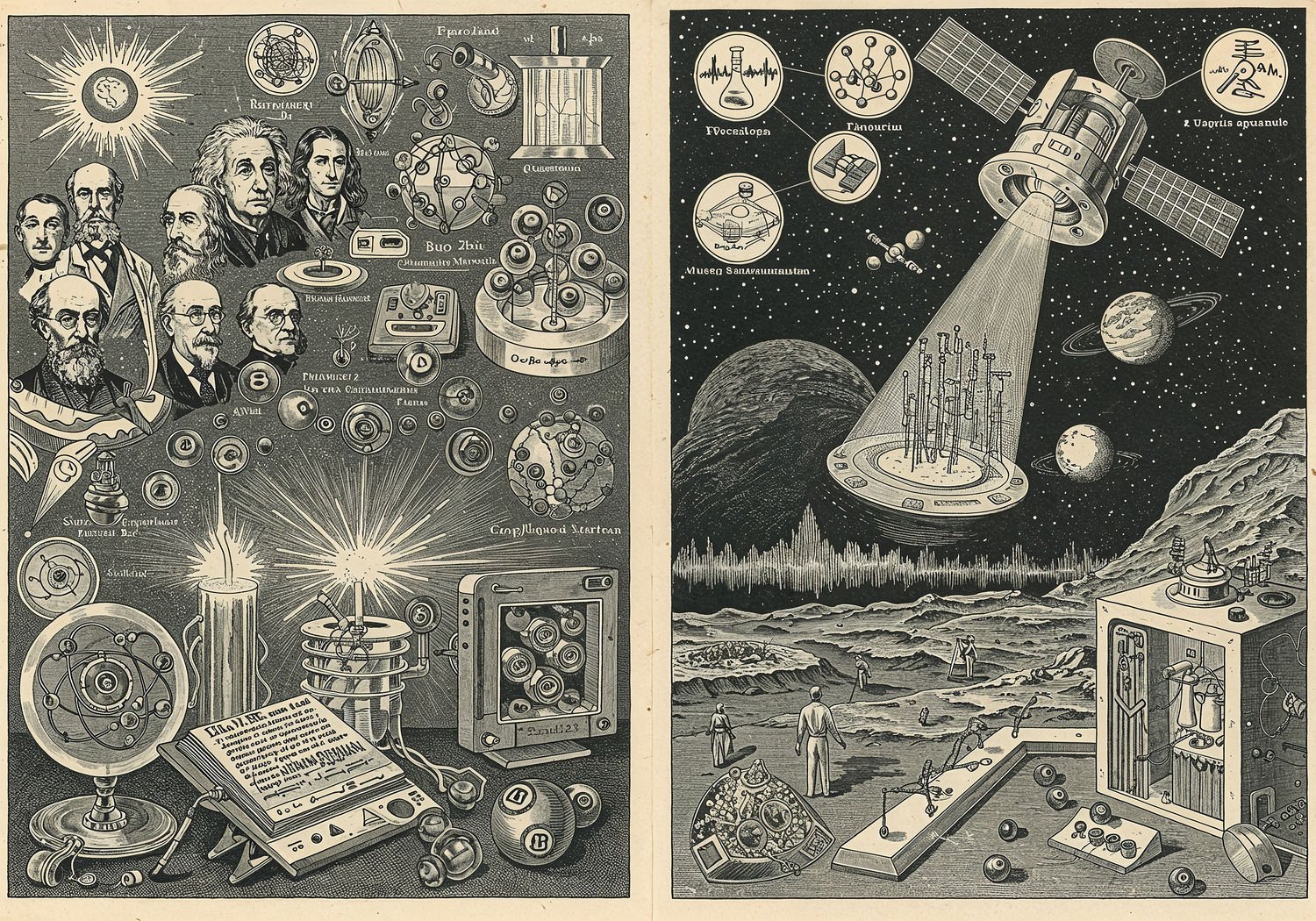 Traditional detailed engraving illustration with modern elements, etched lines, high contrast black and white, meticulous cross-hatching to create depth, printed on aged parchment paper of: Traditional detailed engraving illustration with modern elements, etched lines, high contrast black and white, meticulous cross-hatching to create depth, printed on aged parchment paper of: A dynamic scene illustrating the quantum revolution: on the left, historical scientists like Max Planck, Albert Einstein, Niels Bohr, Erwin Schrödinger, and Werner Heisenberg gathered around glowing atoms, electrons jumping orbits, and light waves turning into photons; in the center, a futuristic quantum computer with multiple qubits in superposition shown as overlapping states of 0 and 1, connected by entangled particle pairs linking distant points; on the right, a satellite in space beaming entangled photons to Earth-based receivers, forming a secure quantum network with icons of applications like medicine simulations, AI processing, and unbreakable encryption; subtle double-slit experiment waves interfering in the background, transitioning from classical billiard balls to probabilistic quantum clouds. Illustration: copperplate etching texture, ink lines, dramatic shading, artistic style, deep focus, museum quality print with humorous twist. Illustration: copperplate etching texture, ink lines, dramatic shading, artistic style, deep focus, museum quality print with humorous twist.