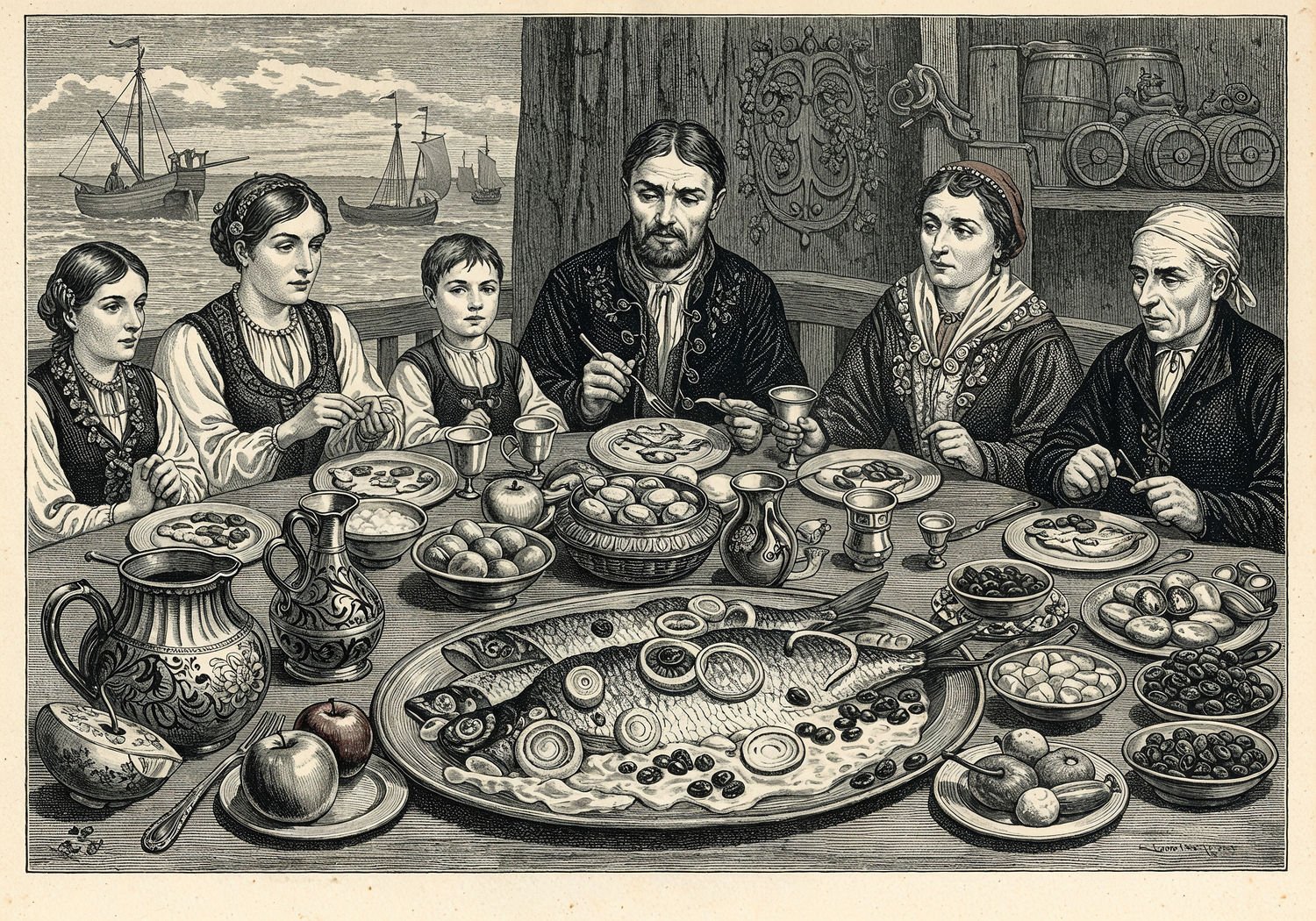 Traditional detailed engraving illustration, etched lines, high contrast black and white, meticulous cross-hatching to create depth, printed on aged parchment paper of: Traditional detailed engraving illustration, etched lines, high contrast black and white, meticulous cross-hatching to create depth, printed on aged parchment paper of: A traditional Polish Christmas Eve dinner table laden with twelve symbolic dishes, prominently featuring a large platter of herring fillets in creamy sauce garnished with onions, apples, and raisins, surrounded by family members in festive attire sharing the meal, with subtle background elements of a North Sea fishing boat and ancient trade barrels evoking historical import routes. Illustration: copperplate etching texture, ink lines, dramatic shading, art style inspired by Gustave Doré and Albrecht Dürer, deep focus, museum quality print. Illustration: copperplate etching texture, ink lines, dramatic shading, art style inspired by Gustave Doré and Albrecht Dürer, deep focus, museum quality print.