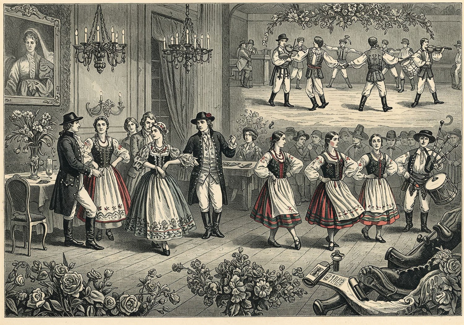 Traditional detailed engraving illustration with modern elements, etched lines, high contrast black and white, meticulous cross-hatching to create depth, printed on aged parchment paper of: Traditional detailed engraving illustration with modern elements, etched lines, high contrast black and white, meticulous cross-hatching to create depth, printed on aged parchment paper of: A vibrant historical scene depicting the evolution of Polish dances: in the foreground, elegant nobility in 18th-century attire performing a stately polonez in a grand ballroom with chandeliers and ornate furniture, couples gliding in measured steps led by a host and hostess; in the background, transitioning to a rustic village wedding where peasants in traditional folk clothing form a lively chmiel circle dance around a maypole-like hop vine, holding hands and leaping energetically; musicians playing violins, drums, and bagpipes scattered throughout both areas; subtle patriotic symbols like Polish eagles on banners and wildflowers on the floor connecting the two worlds. Illustration: copperplate etching texture, ink lines, dramatic shading, artistic style, deep focus, museum quality print with humorous twist. Illustration: copperplate etching texture, ink lines, dramatic shading, artistic style, deep focus, museum quality print with humorous twist.