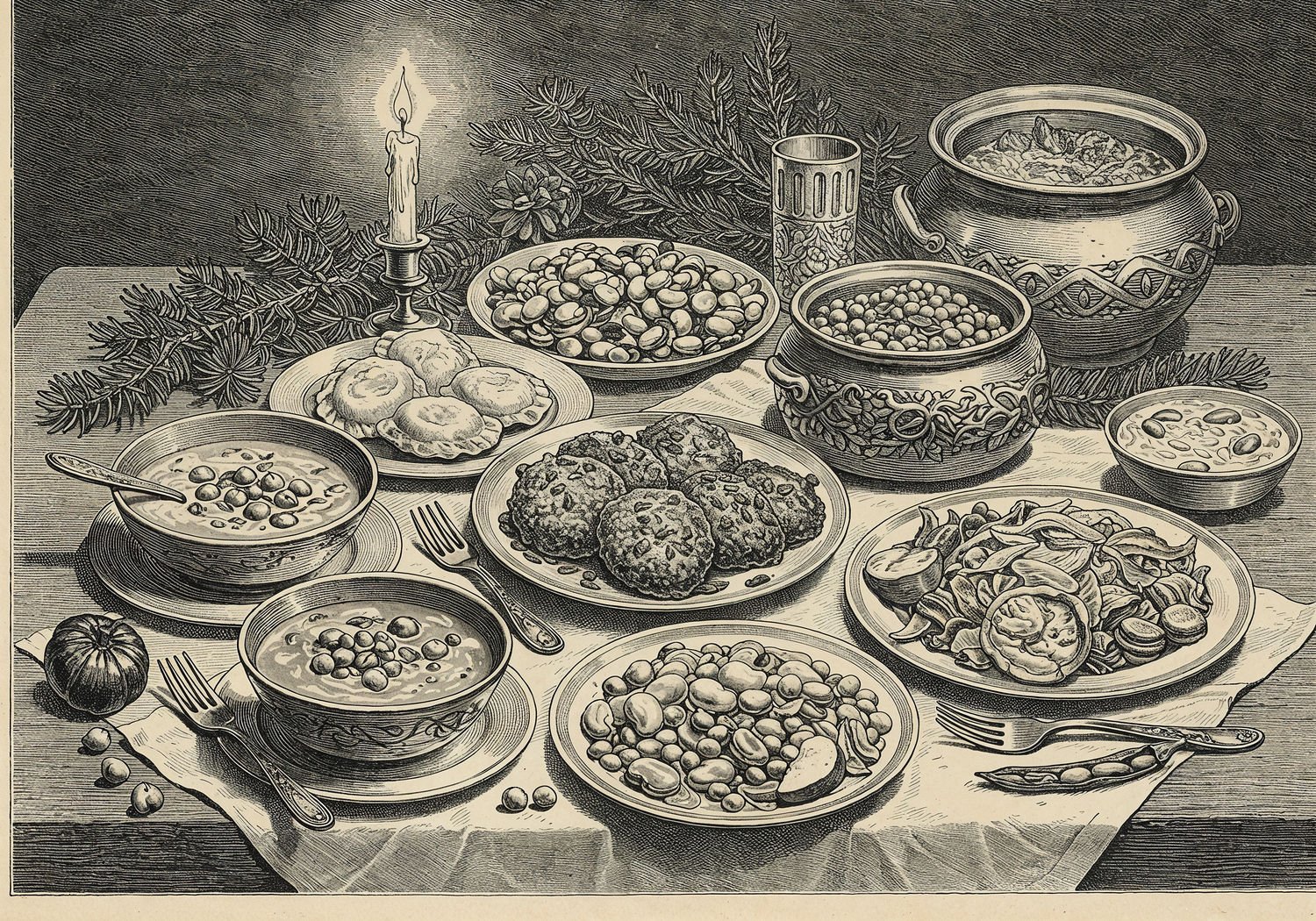 Traditional detailed engraving illustration, etched lines, high contrast black and white, meticulous cross-hatching to create depth, printed on aged parchment paper of: Traditional detailed engraving illustration, etched lines, high contrast black and white, meticulous cross-hatching to create depth, printed on aged parchment paper of: A rustic Polish Christmas Eve table set for wigilia, featuring twelve postne dishes centered on legumes: a steaming bowl of thick chickpea krupnik soup garnished with cumin, pierogi stuffed with mashed lentils and mushrooms, broad bean patties fried in linseed oil beside a salad of young broad beans with apples and vinegar, a pot of lentil zupa with carrots and celery, flat łazanki noodles with chickpeas and cabbage, all arranged on a white tablecloth under candlelight, with evergreen branches, an opłatek wafer, and subtle symbolic elements like scattered broad beans under the cloth representing fertility and souls of the departed, evoking historical humility and abundance. Illustration: copperplate etching texture, ink lines, dramatic shading, art style inspired by Gustave Doré and Albrecht Dürer, deep focus, museum quality print. Illustration: copperplate etching texture, ink lines, dramatic shading, art style inspired by Gustave Doré and Albrecht Dürer, deep focus, museum quality print.