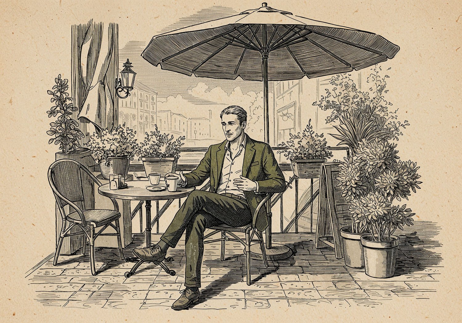 Traditional detailed engraving illustration with modern elements, etched lines, high contrast black and white, meticulous cross-hatching to create depth, printed on aged parchment paper of: Traditional detailed engraving illustration with modern elements, etched lines, high contrast black and white, meticulous cross-hatching to create depth, printed on aged parchment paper of: A man in his 30s sitting relaxed at an outdoor café table under a large umbrella, wearing an olive suede blazer over a white button-up shirt with the top button undone and no tie, paired with dark slim-fit jeans, holding a coffee cup in one hand while gesturing with the other during a conversation, surrounded by potted plants, a light breeze rustling nearby leaves, blue sky in the background, and a subtle view of the café’s exterior. Illustration: copperplate etching texture, ink lines, dramatic shading, artistic style, deep focus, museum quality print with humorous twist. Illustration: copperplate etching texture, ink lines, dramatic shading, artistic style, deep focus, museum quality print with humorous twist.