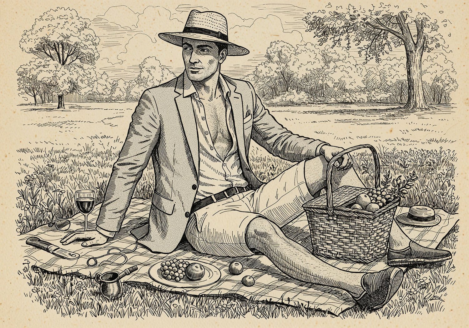Traditional detailed engraving illustration with modern elements, etched lines, high contrast black and white, meticulous cross-hatching to create depth, printed on aged parchment paper of: Traditional detailed engraving illustration with modern elements, etched lines, high contrast black and white, meticulous cross-hatching to create depth, printed on aged parchment paper of: A man in a light gray linen blazer, open white button-down shirt revealing his chest, and beige slim-fit shorts sits relaxed on a picnic blanket in a sunny park, holding a wicker picnic basket with fruits and wine, surrounded by green grass, trees, and a blue sky, wearing a straw fedora hat and brown leather belt, with espadrilles on his feet. Illustration: copperplate etching texture, ink lines, dramatic shading, artistic style, deep focus, museum quality print with humorous twist. Illustration: copperplate etching texture, ink lines, dramatic shading, artistic style, deep focus, museum quality print with humorous twist.