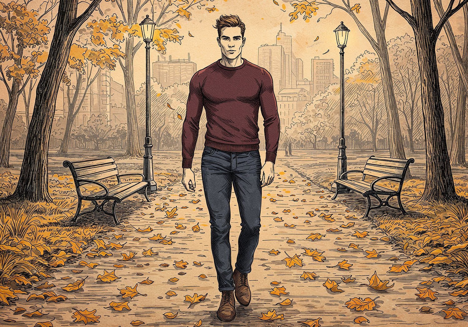 Traditional detailed engraving illustration with modern elements, etched lines, high contrast black and white, meticulous cross-hatching to create depth, printed on aged parchment paper of: Traditional detailed engraving illustration with modern elements, etched lines, high contrast black and white, meticulous cross-hatching to create depth, printed on aged parchment paper of: A confident athletic man with a V-shaped silhouette walking on a leafy autumn park path during a cool windy day, wearing a fitted burgundy sweater that hugs his shoulders and chest, slim dark indigo jeans tucked into brown leather chukka boots, surrounded by falling golden leaves and gray urban trees in the background. Illustration: copperplate etching texture, ink lines, dramatic shading, artistic style, deep focus, museum quality print with humorous twist. Illustration: copperplate etching texture, ink lines, dramatic shading, artistic style, deep focus, museum quality print with humorous twist.