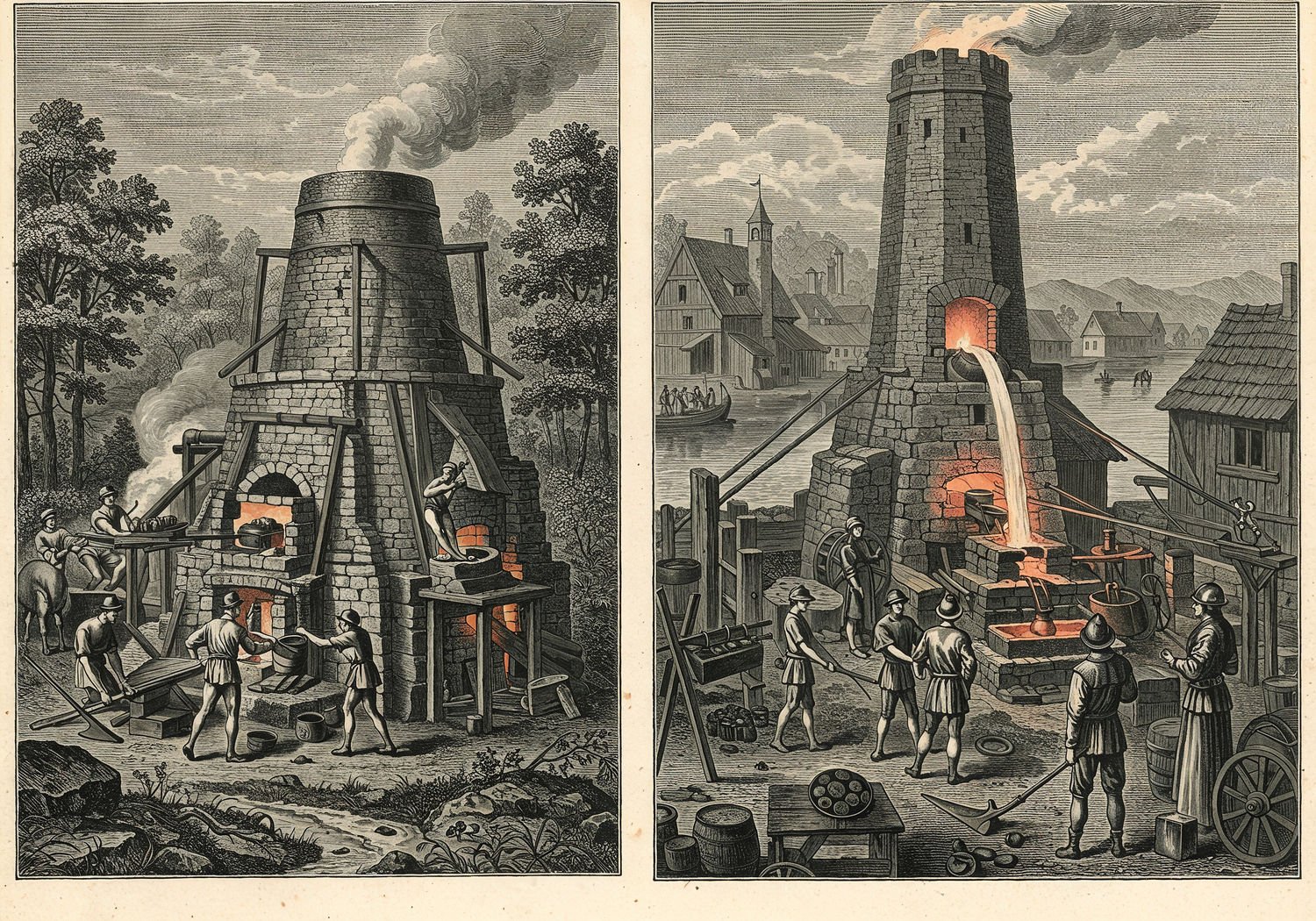 Traditional detailed engraving illustration with modern elements, etched lines, high contrast black and white, meticulous cross-hatching to create depth, printed on aged parchment paper of: Traditional detailed engraving illustration with modern elements, etched lines, high contrast black and white, meticulous cross-hatching to create depth, printed on aged parchment paper of: A split-scene illustration showing the evolution of medieval iron production: on the left, a primitive clay and stone bloomery furnace in a forested clearing, with workers using bellows to heat ore in a conical structure, extracting a solid bloom of iron while smoke rises; on the right, a tall blast furnace in a 13th-century European village near a river, powered by a water wheel driving large bellows, molten pig iron pouring from the base into molds, surrounded by workers handling ore, charcoal, and limestone flux, with finished products like heavy plows, swords, and armor displayed nearby, and a feudal lord overseeing the operation. Illustration: copperplate etching texture, ink lines, dramatic shading, artistic style, deep focus, museum quality print with humorous twist. Illustration: copperplate etching texture, ink lines, dramatic shading, artistic style, deep focus, museum quality print with humorous twist.