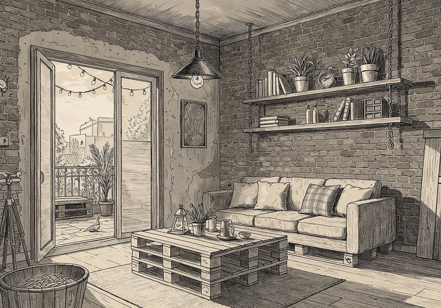 Traditional detailed engraving illustration with modern elements, etched lines, high contrast black and white, meticulous cross-hatching to create depth, printed on aged parchment paper of: Traditional detailed engraving illustration with modern elements, etched lines, high contrast black and white, meticulous cross-hatching to create depth, printed on aged parchment paper of: A cozy industrial-style living room with exposed brick walls and concrete floors, featuring a hanging lamp made from black metal pipes with a vintage bulb, floating wooden shelves suspended by thick metal chains holding books and potted plants, and a rustic coffee table constructed from wooden pallets with visible screws and raw edges, integrated into an open space that transitions to an outdoor terrace with pallet furniture under string lights. Illustration: copperplate etching texture, ink lines, dramatic shading, artistic style, deep focus, museum quality print with humorous twist. Illustration: copperplate etching texture, ink lines, dramatic shading, artistic style, deep focus, museum quality print with humorous twist.